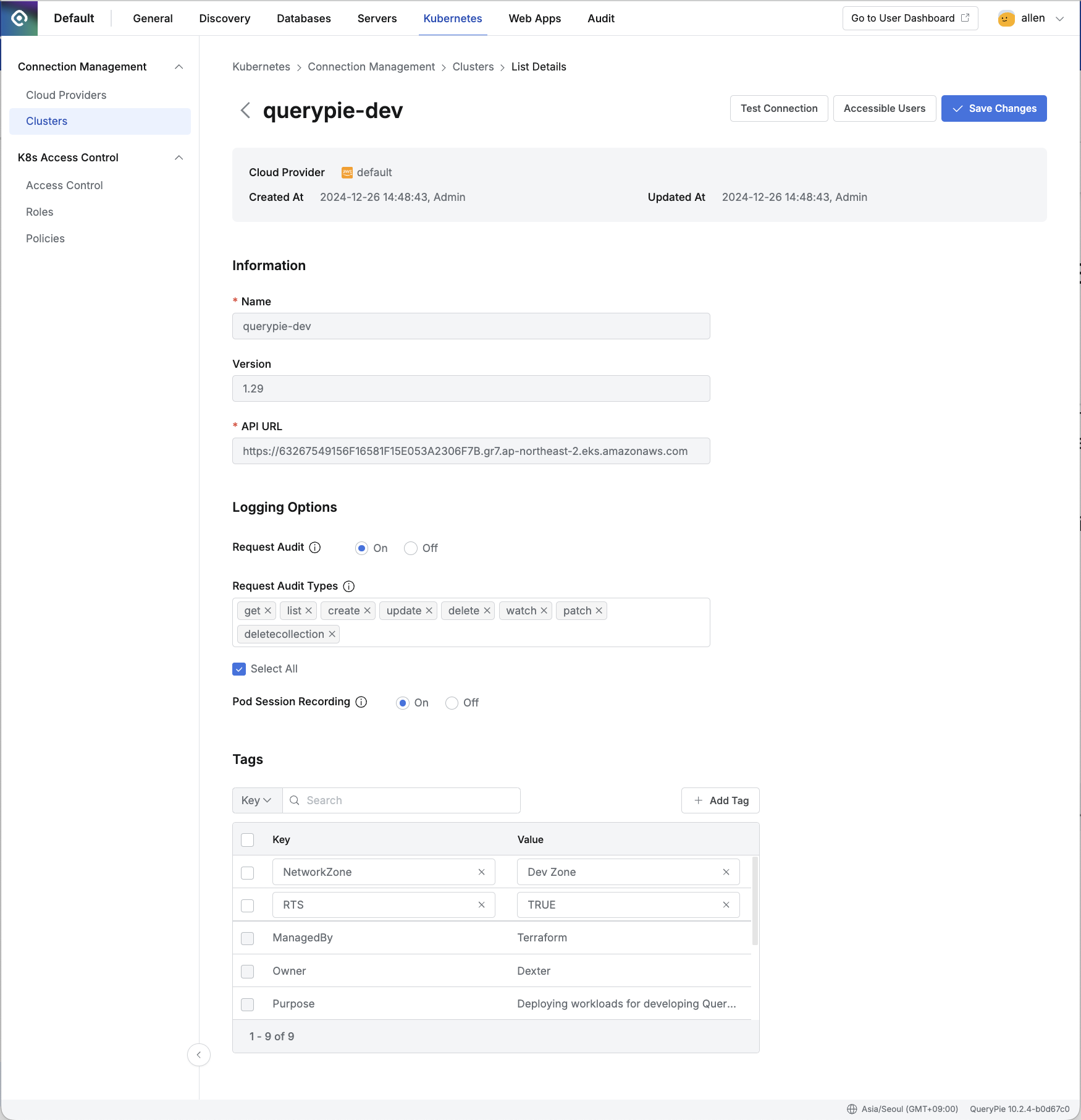 Administrator > Kubernetes > Connection Management > Clusters > List Details