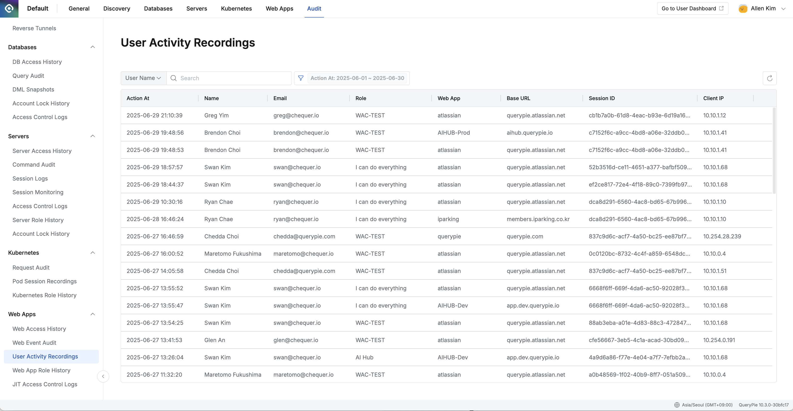 - Navigate to the Administrator > Audit > Web Apps > User Activity Recordings menu.