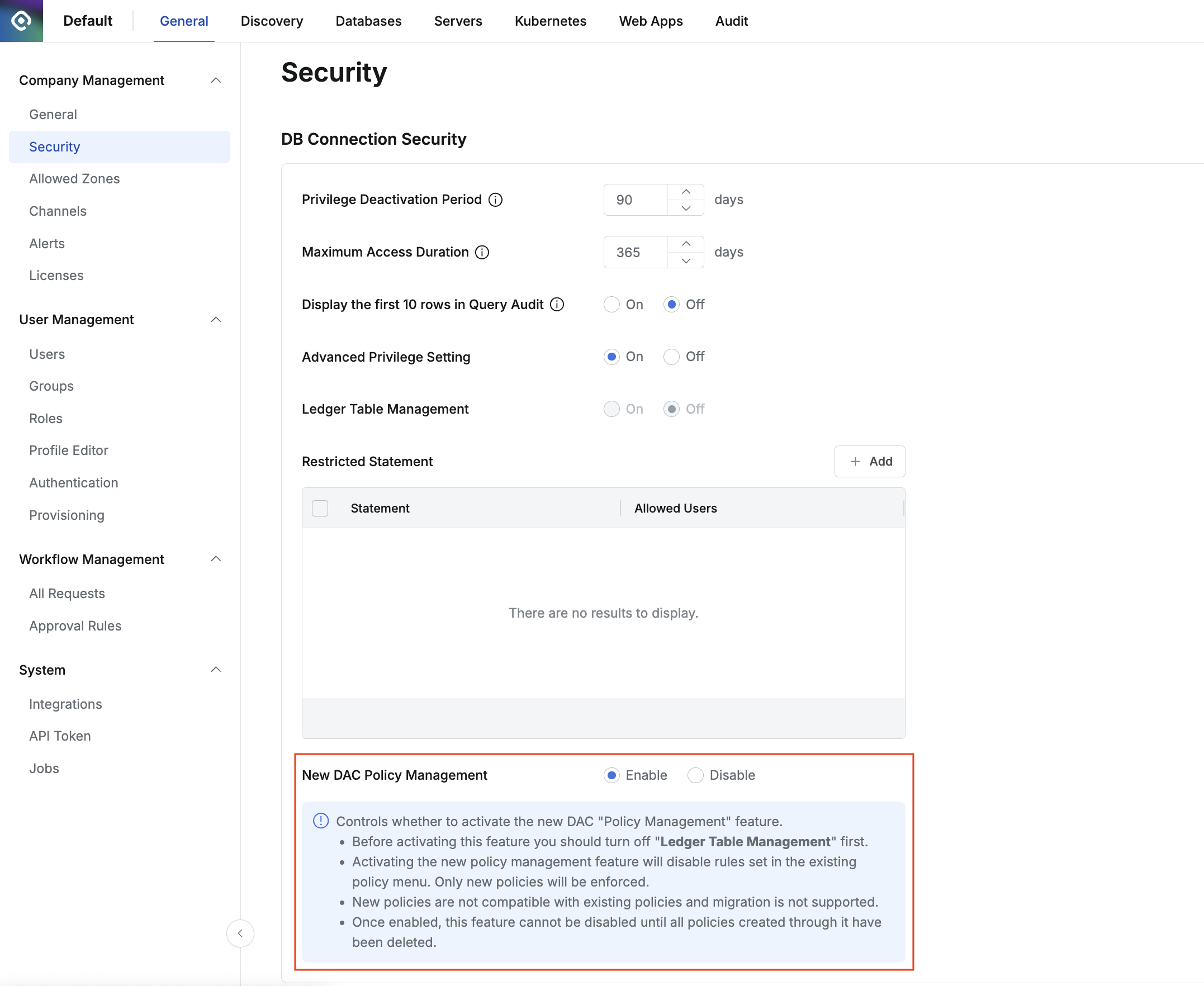 In General > Company Management > Security, set New DAC Policy Management to Enable in the DB Connection Security sub-item. (Default value: Disable)