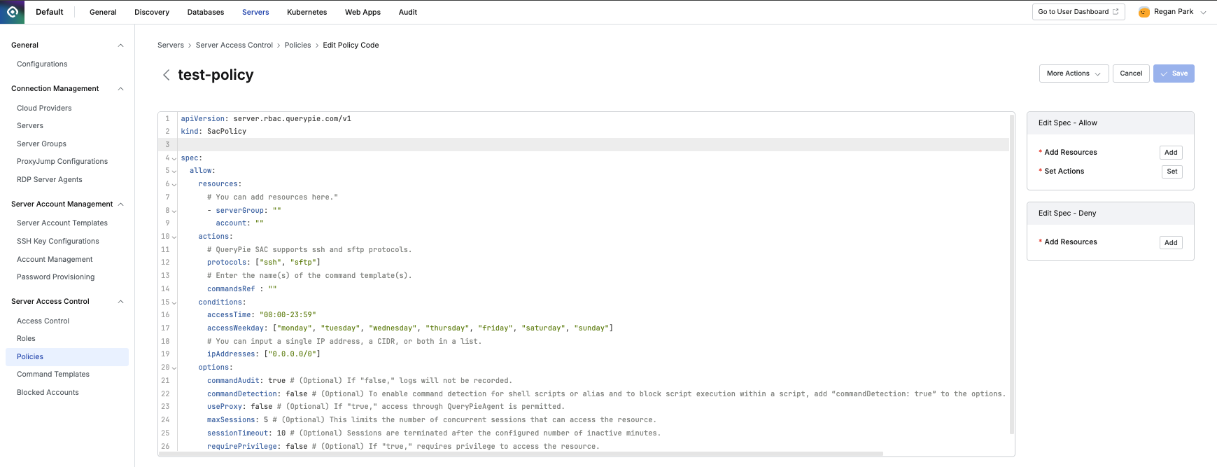 You can manage access policies (Policy) for servers managed by the organization. Policies operate based on YAML Code in a form similar to IaC. You can not only set the days and times when access is allowed, but also set accessible IP addresses, audit settings, and agent usage availability. In addition, you can set the number of allowed sessions per user.
