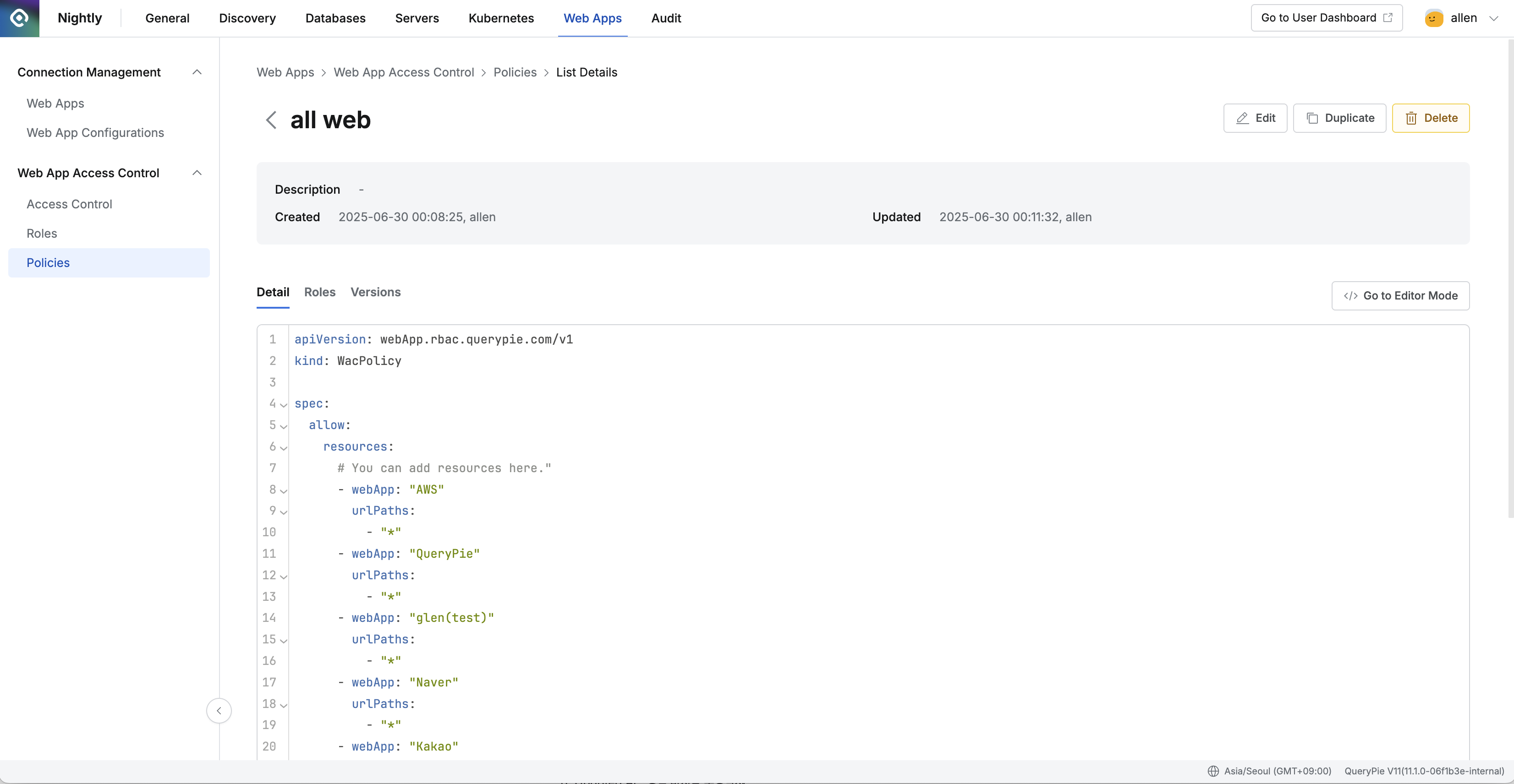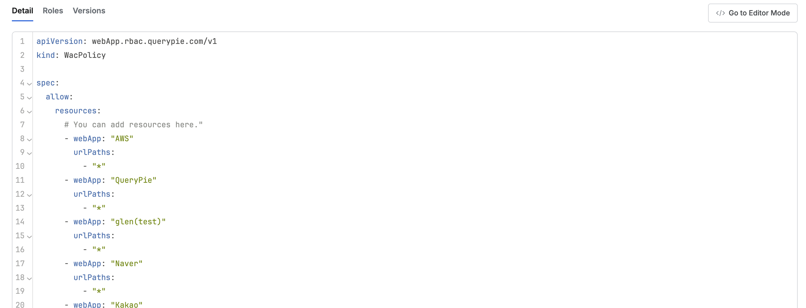 Go to Editor Modebutton on the right of the Detail tab, and clicking it switches to the corresponding Code Editor page screen. - Roles
