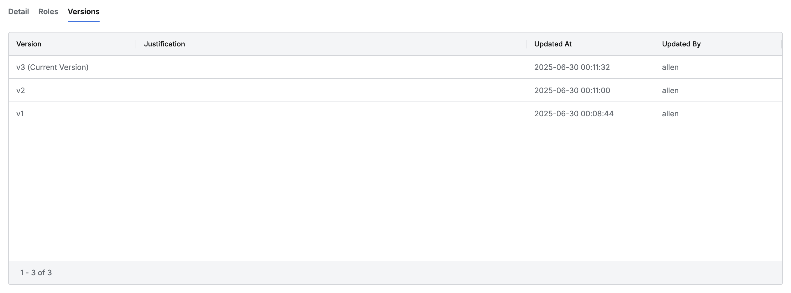 - Clicking each row provides detailed information about the version in drawer format.