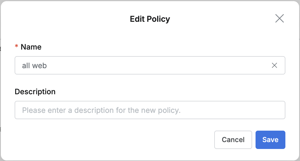 Supports viewing, creating, modifying, and deleting access policies (Policy) for web applications managed by the organization. Policy is the core foundational step for implementing and applying web application access permissions.