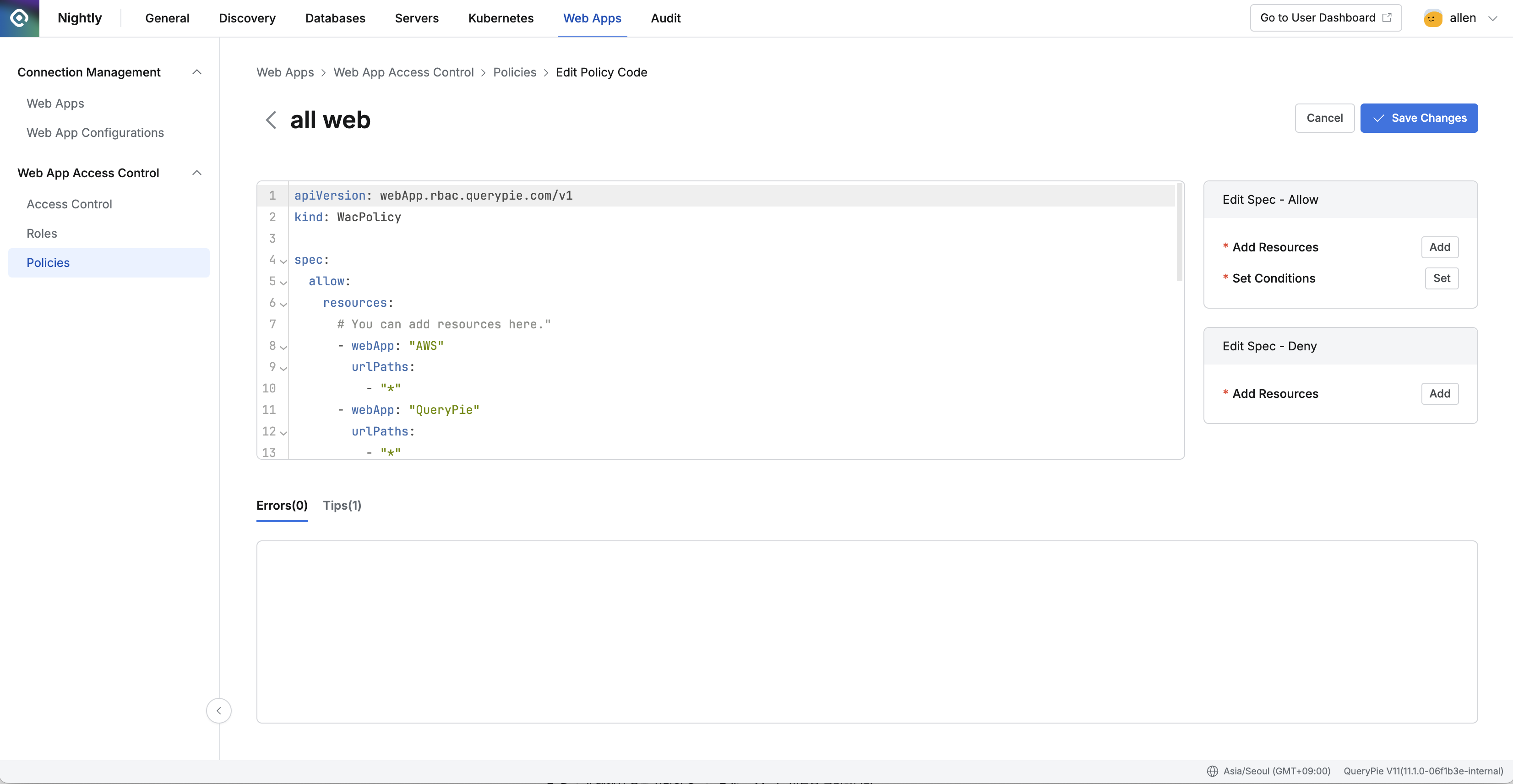 - Directly edit policy code in YAML format in the left code editor