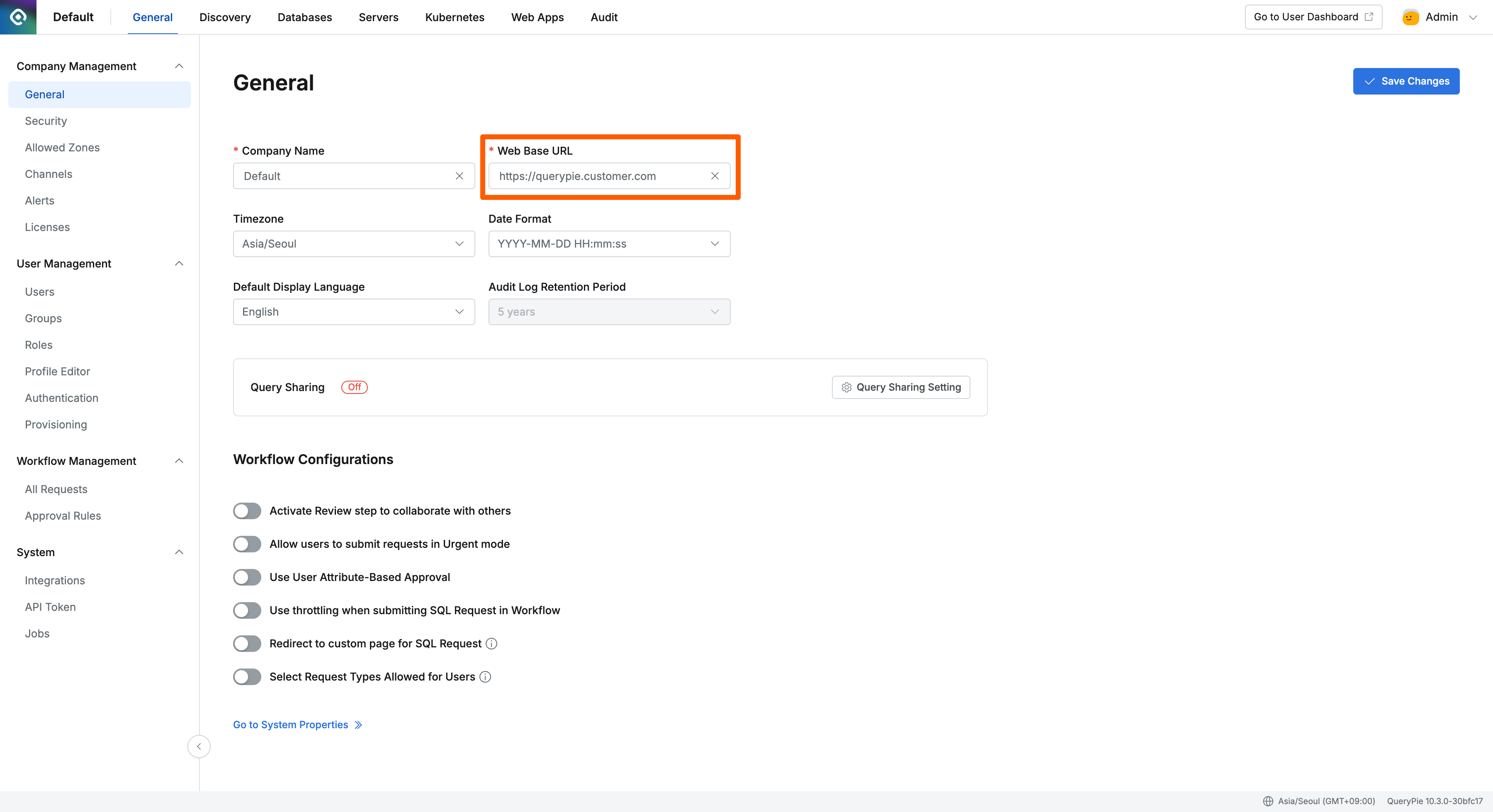 Configuration path: Admin Page → General This is the URL address of QueryPie for accessing the Web Console. (Example.