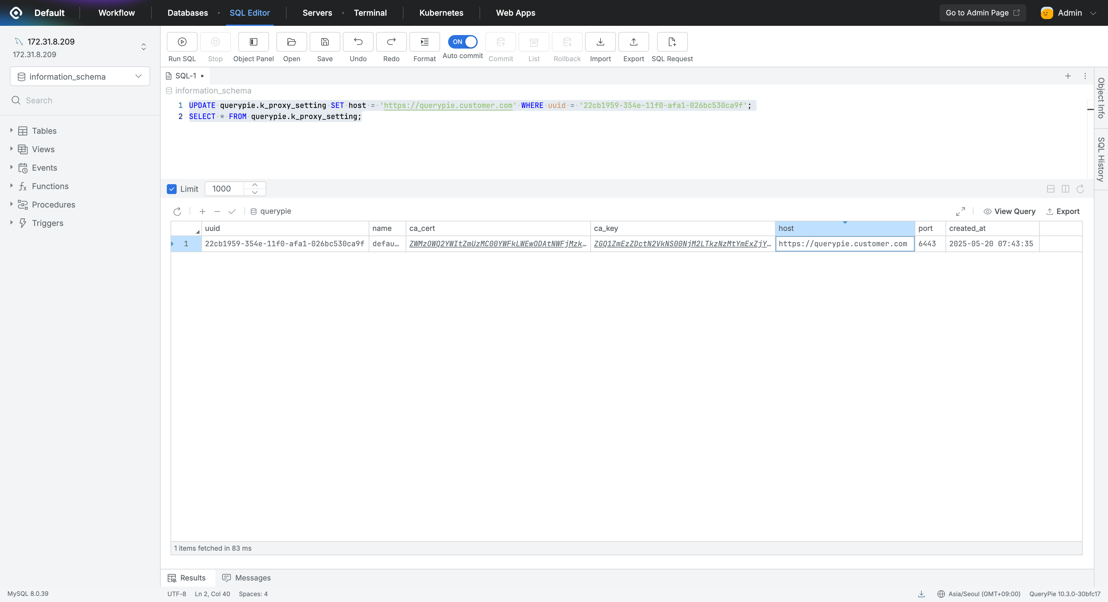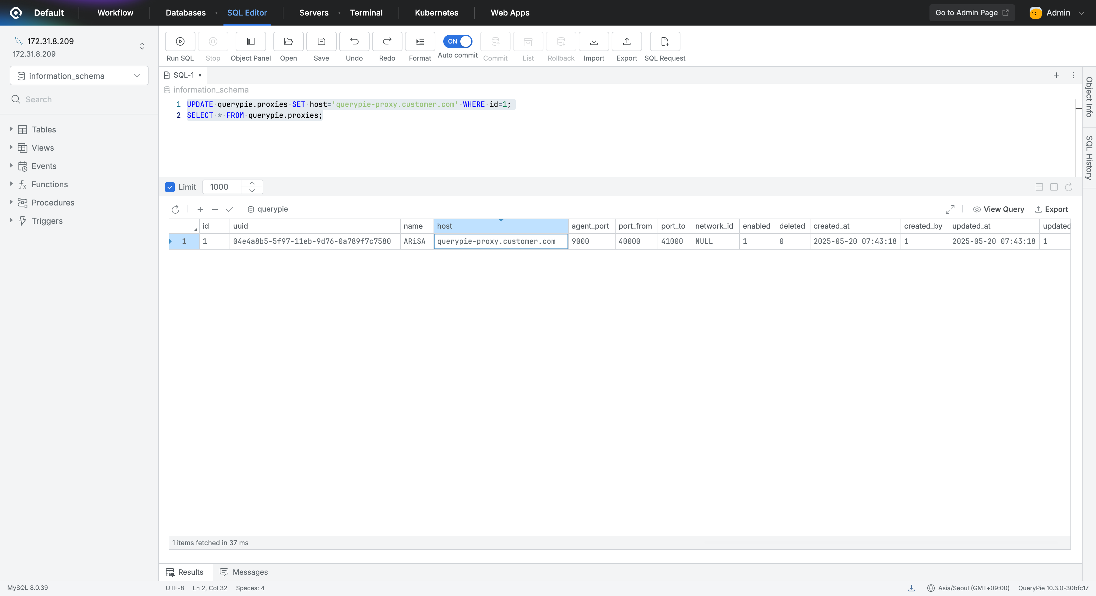 UPDATE querypie.proxies SET host = '<customer-proxy-address>' WHERE id = 1;If the query executes without errors, run the following query to verify the registration.
