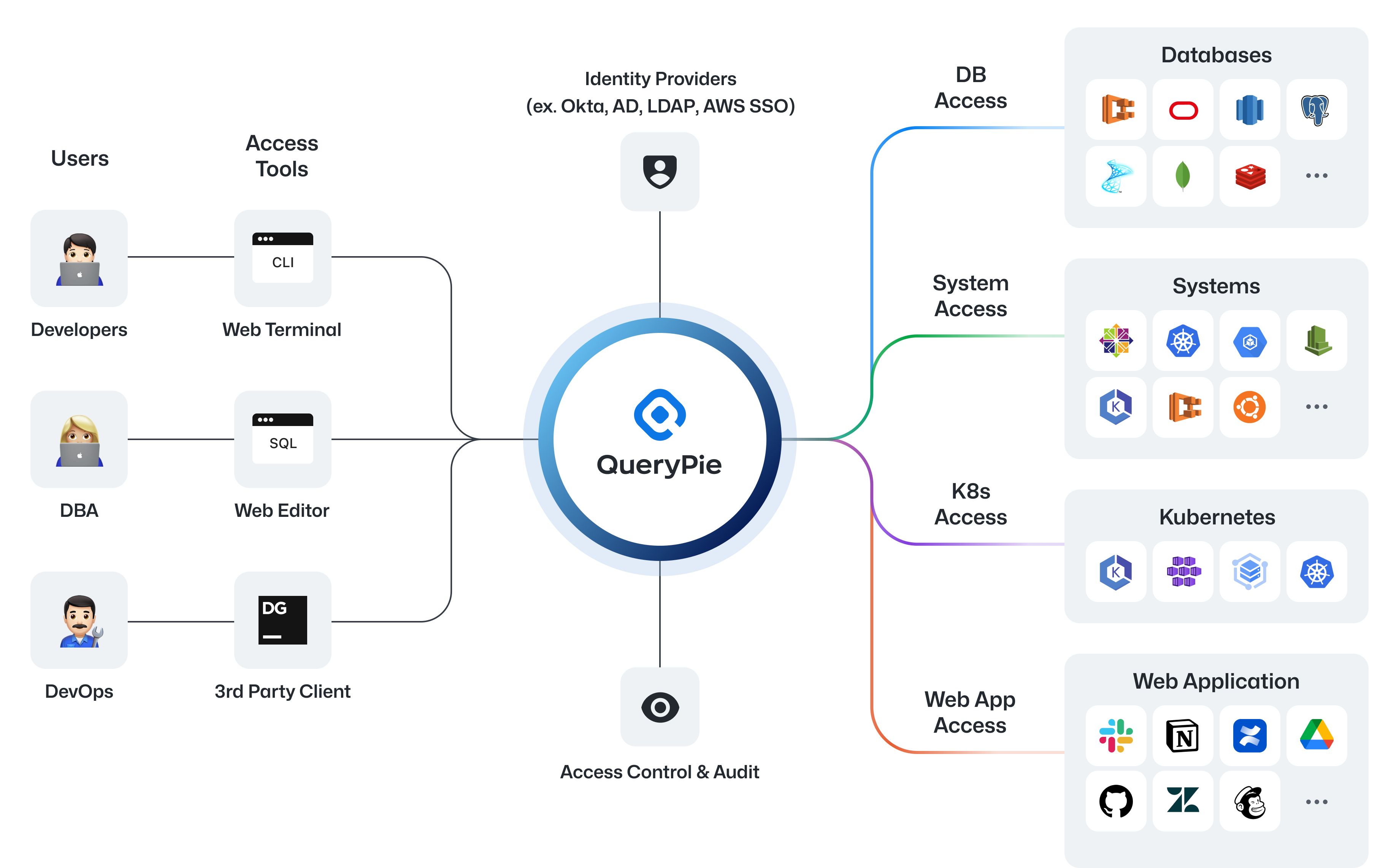 QueryPie ACP continuously explores ways to securely protect sensitive data within enterprises, even in cloud environments. Currently, QueryPie ACP primarily provides database, system, and Kubernetes access control and auditing, along with access control for web applications.