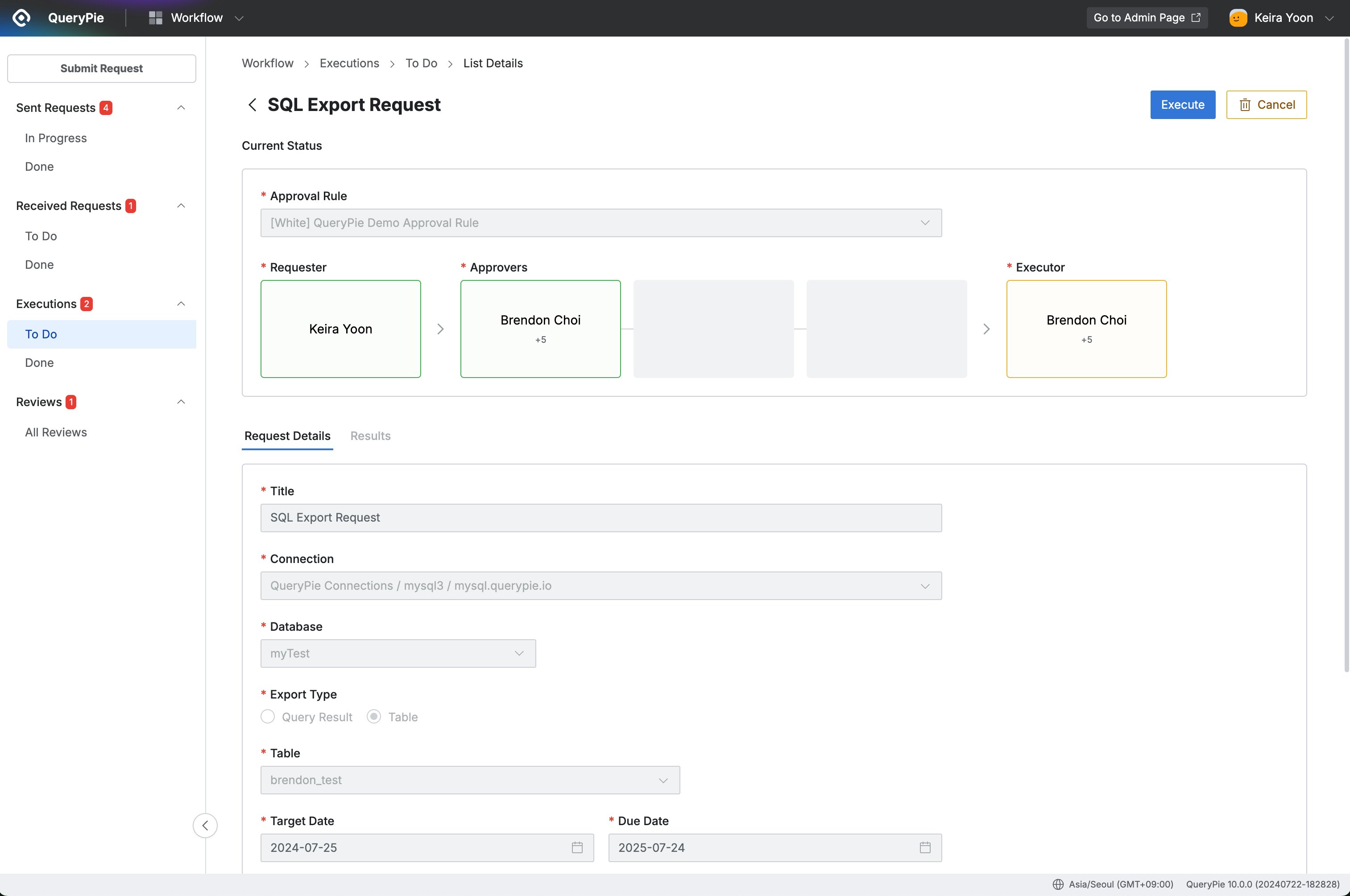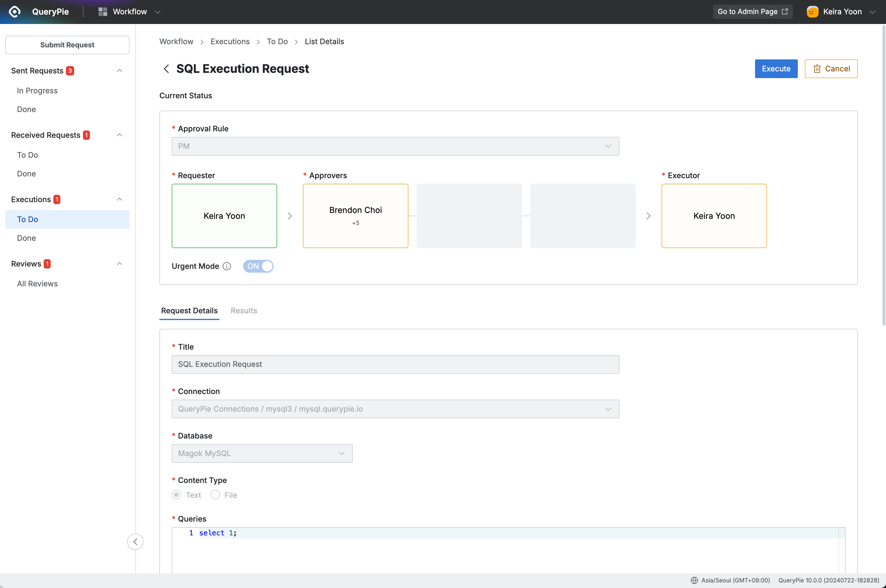 - SQL Request: You can request SQL execution that requires approval, and you can execute the query once after approval.