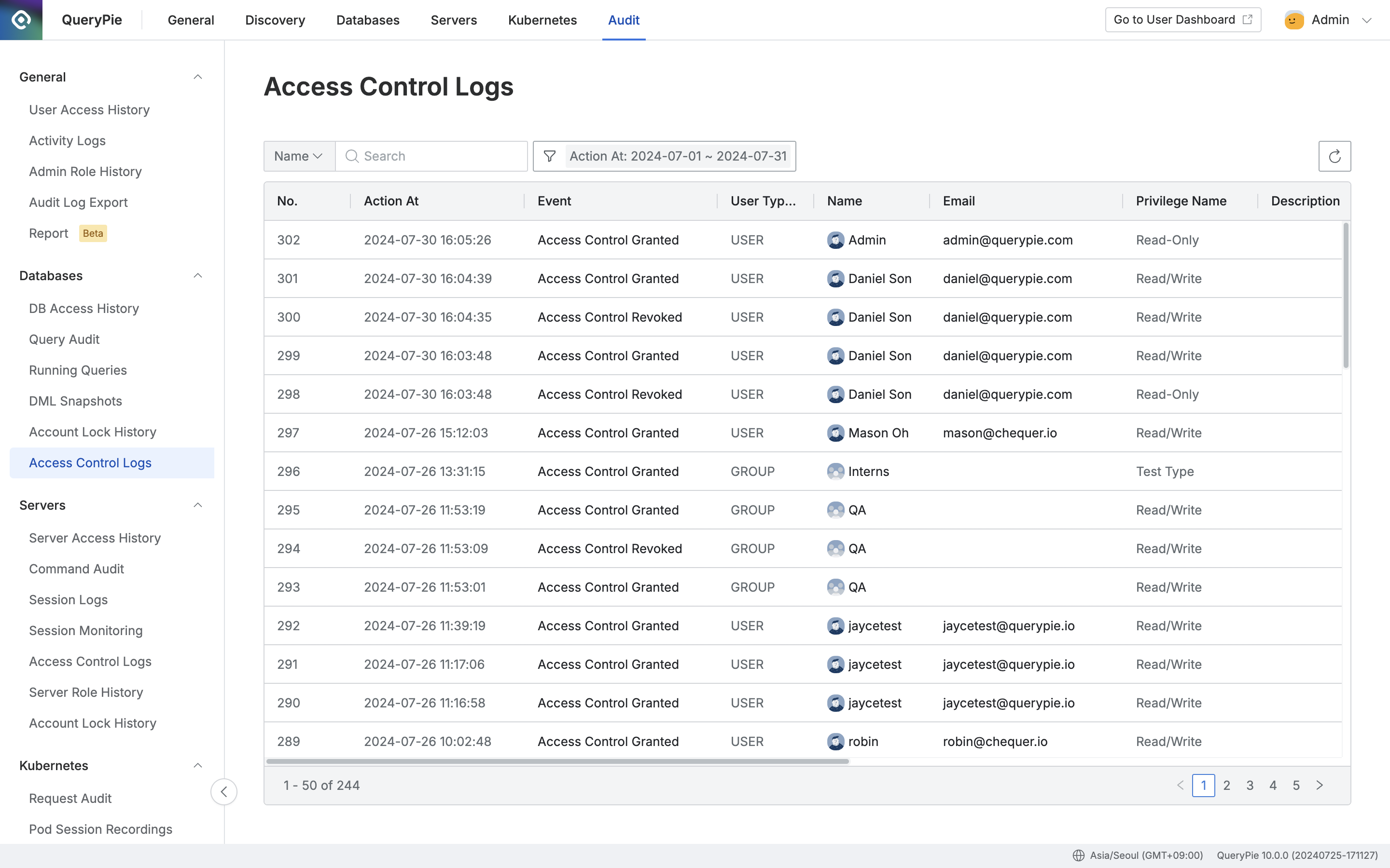 - Administrator > Audit > Databases > Access Control Logsメニューに移動します。