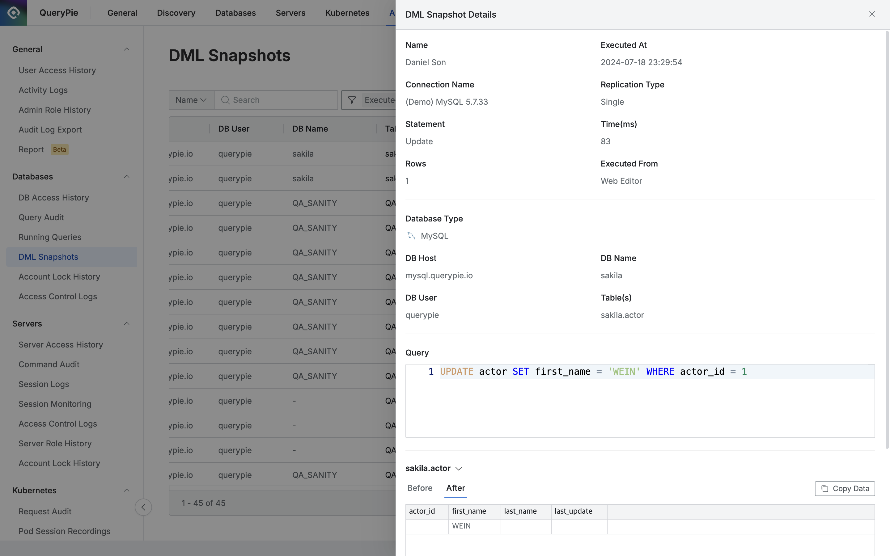 QueryPieでINSERT / UPDATE / DELETEクエリ実行完了時前後データを記録します。 該当スナップショットは各DBコネクション別別途DML Snapshot設定を有効化した場合結果情報を保存します。 (DB Connections内 追加設定 参照)