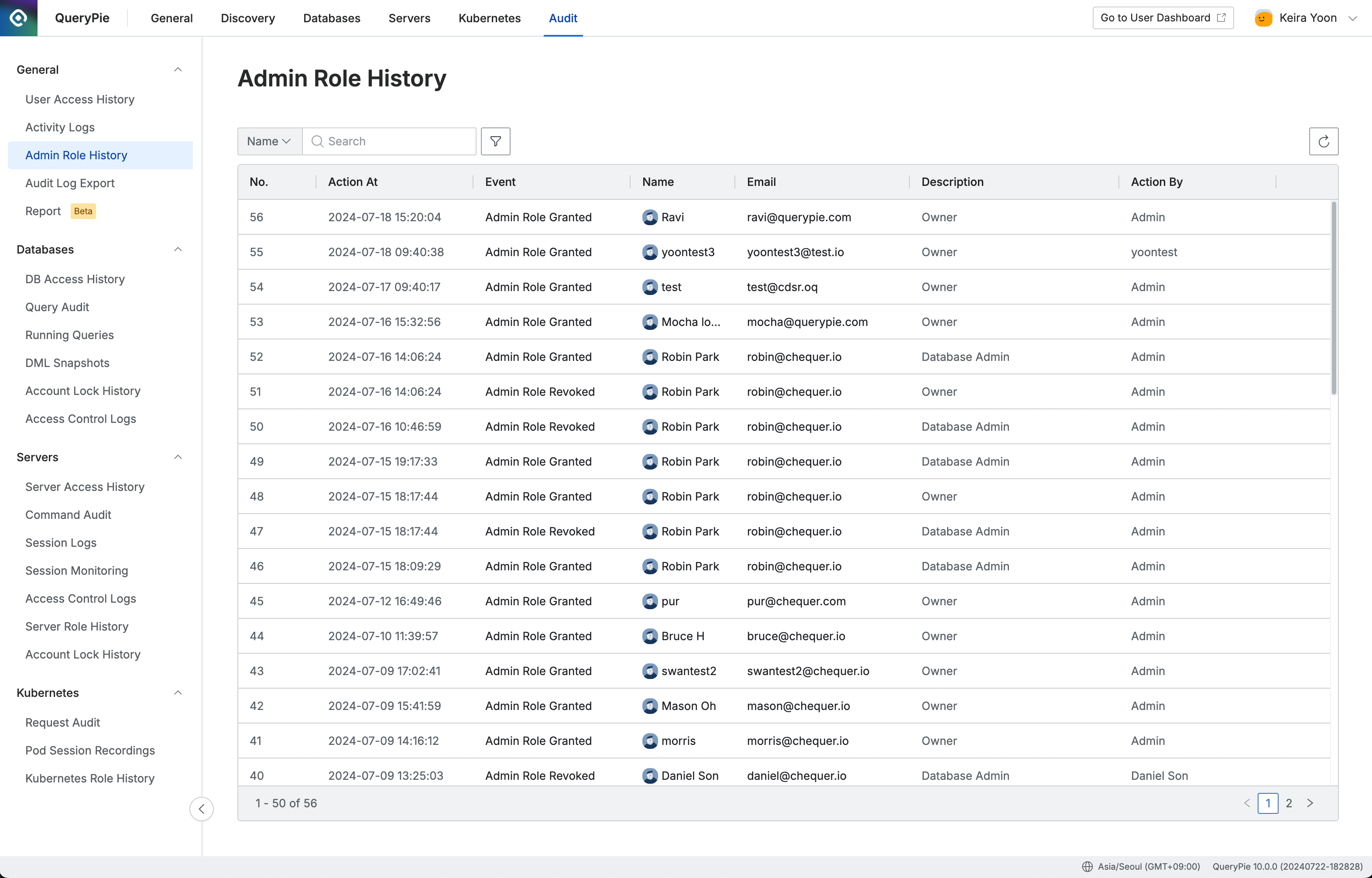Administrator > General > User Management > Usersページで特定のユーザーに管理者権限を付与または回収する場合、Admin Role Historyに履歴が残ります。