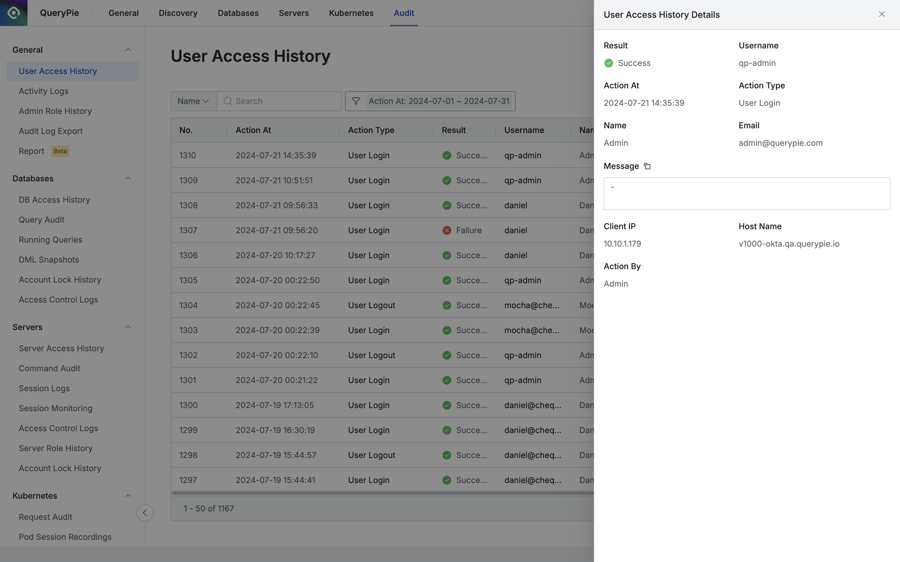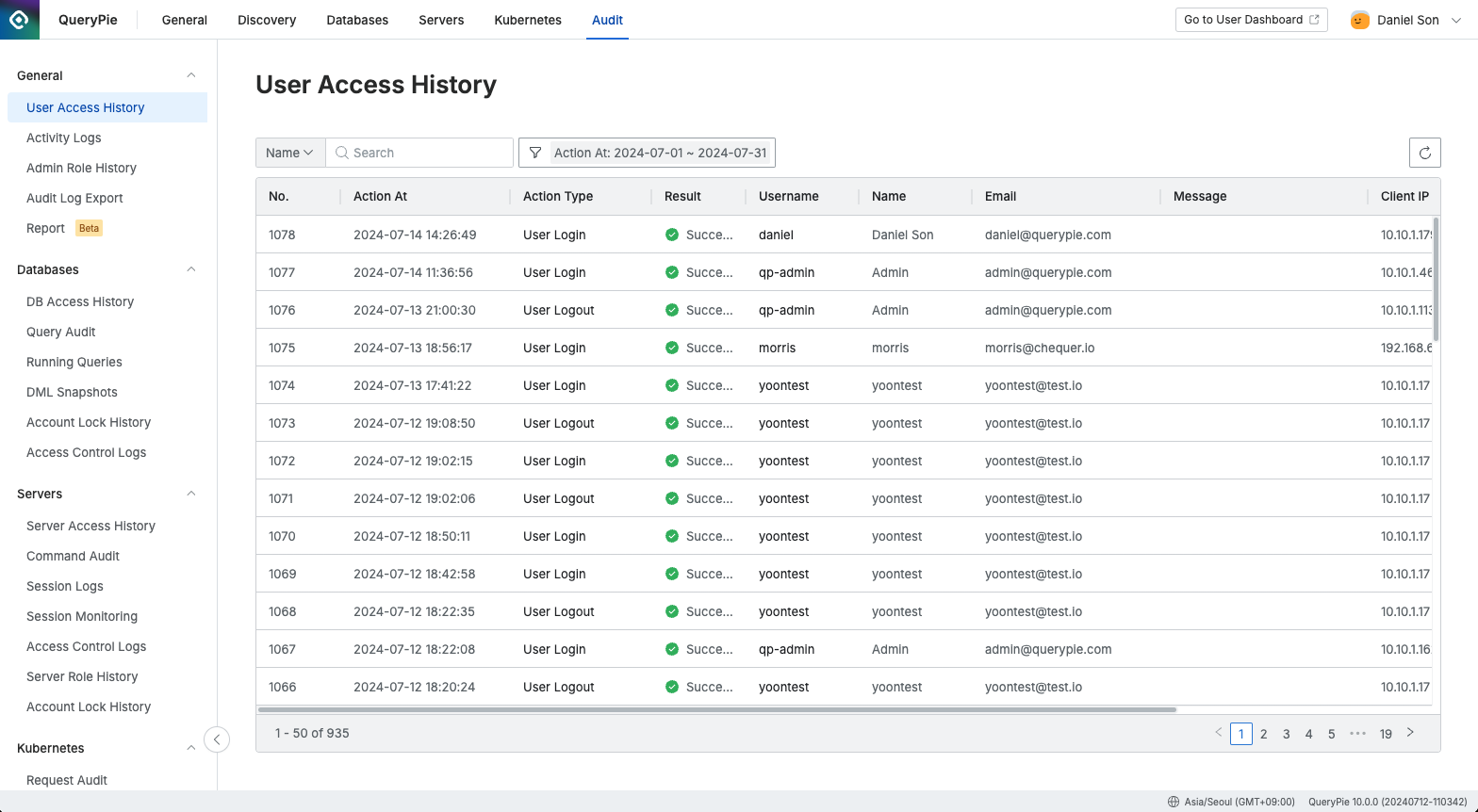 すべてのユーザーのQueryPieシステムアクセスに関連するすべての履歴、すなわちアカウントログイン/ログアウト、アカウントの状態変更、パスワードリセットメッセージ送信などの履歴を照会できます。