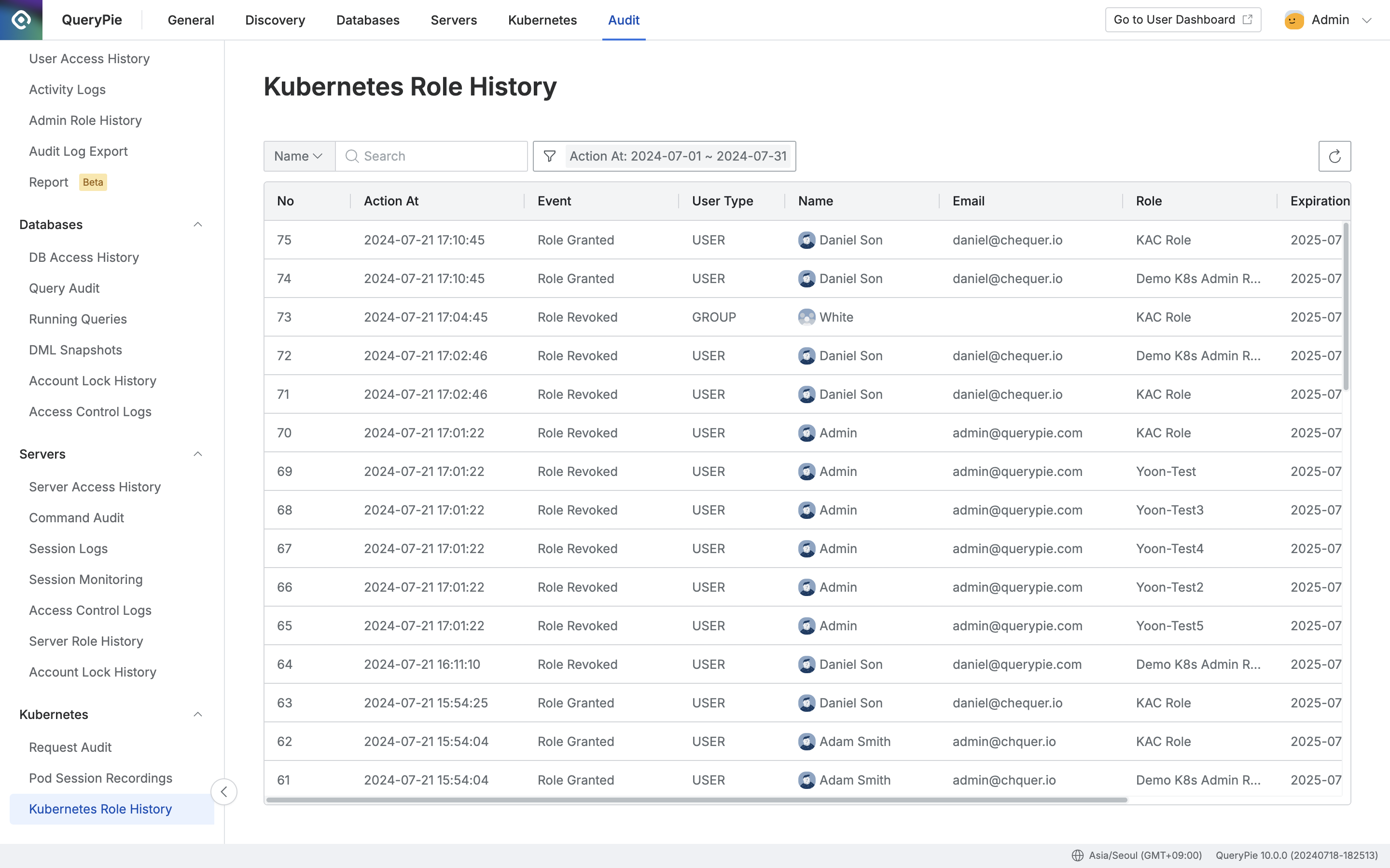 Administrator > Audit > Kubernetes > Kubernetes Role History