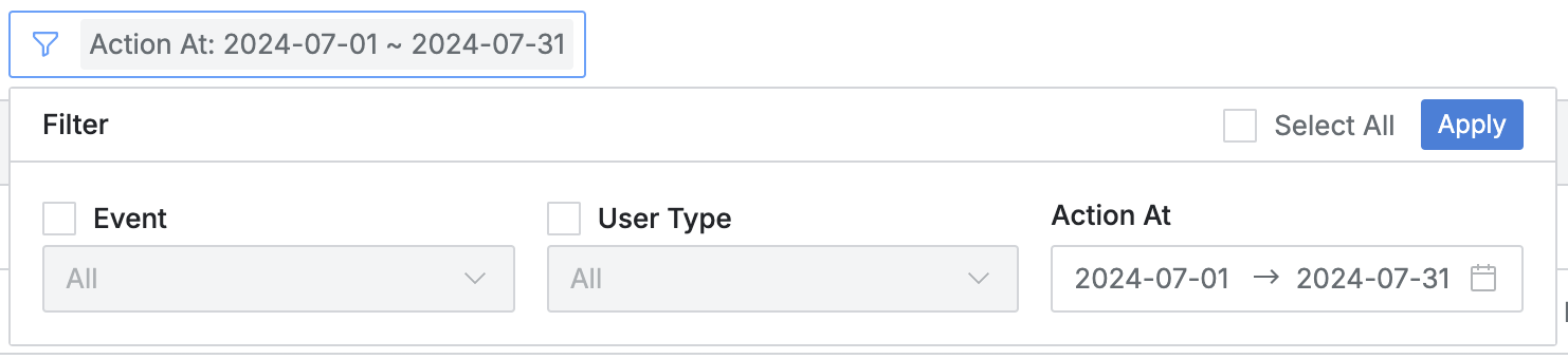 - Action At当月00:00~23:59基準で降順にログが照会されます。