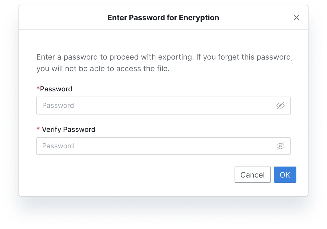 Export a file with Encryption共通オプションがRequiredでアクティブになっている場合、該当ダウンロード時に暗号化モーダルが追加で現れ、該当モーダル以降にダウンロードを実行します。