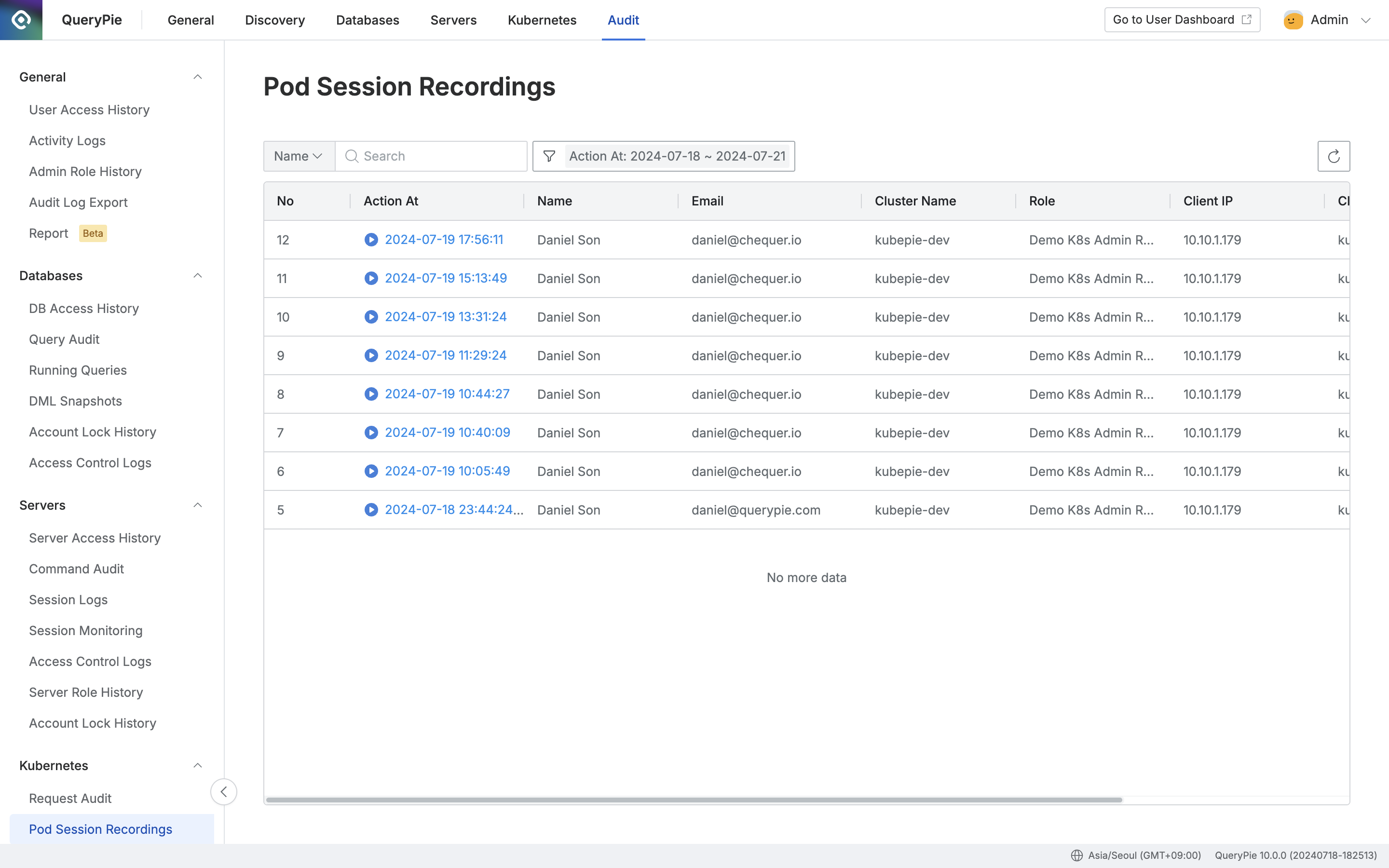 Administrator > Audit > Kubernetes > Pod Session Recordings
