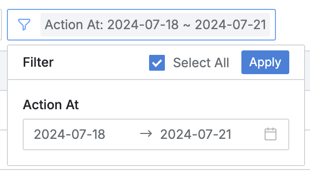- 検索フィールド右側フィルターボタンをクリックして Action At に対する日時範囲を再指定してフィルタリングが可能です。