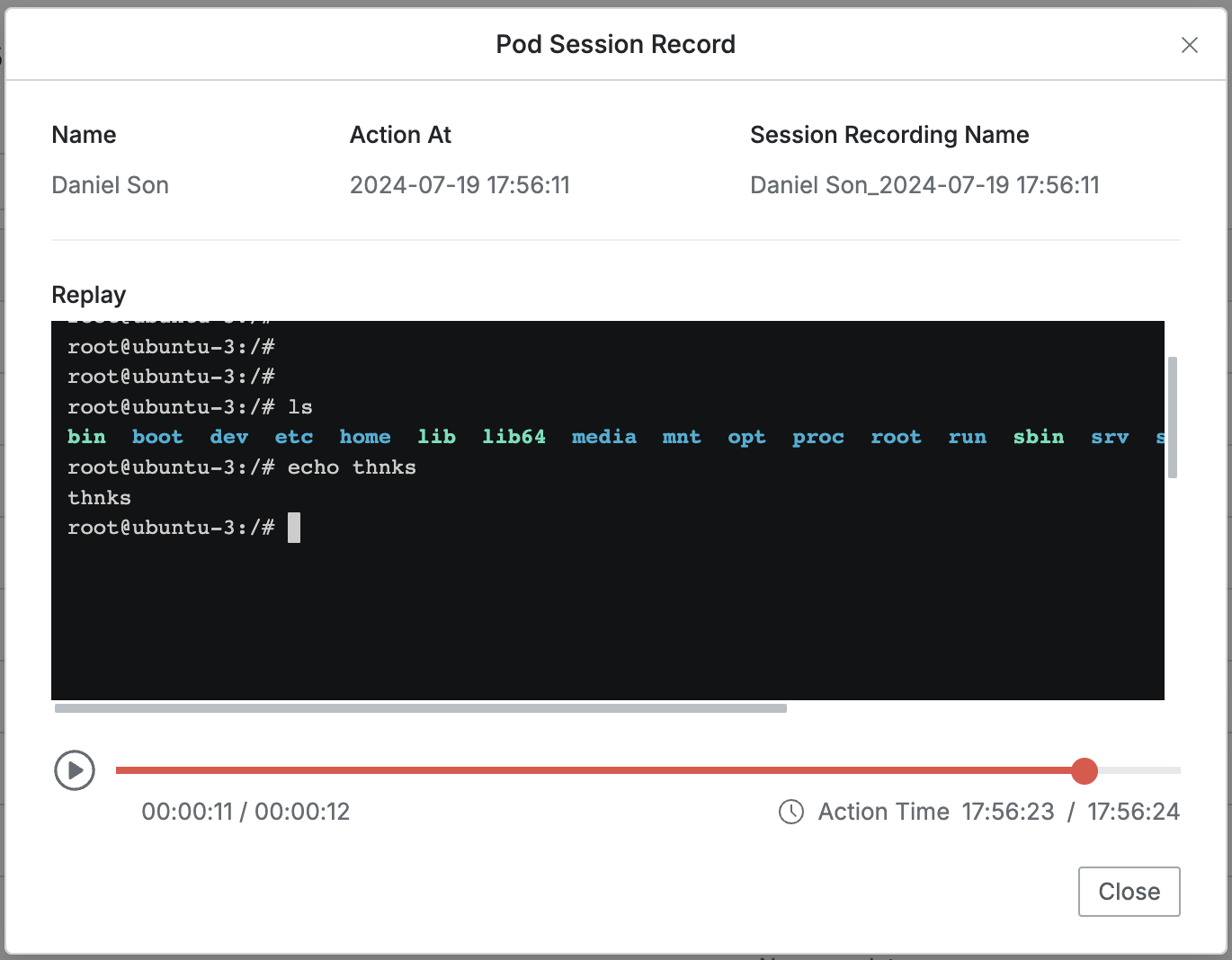 - Pod exec APIで実行時、該当セッションに対するレコーディングが進行され、該当「Session Recording」文句にハイパーリンクが含まれます。