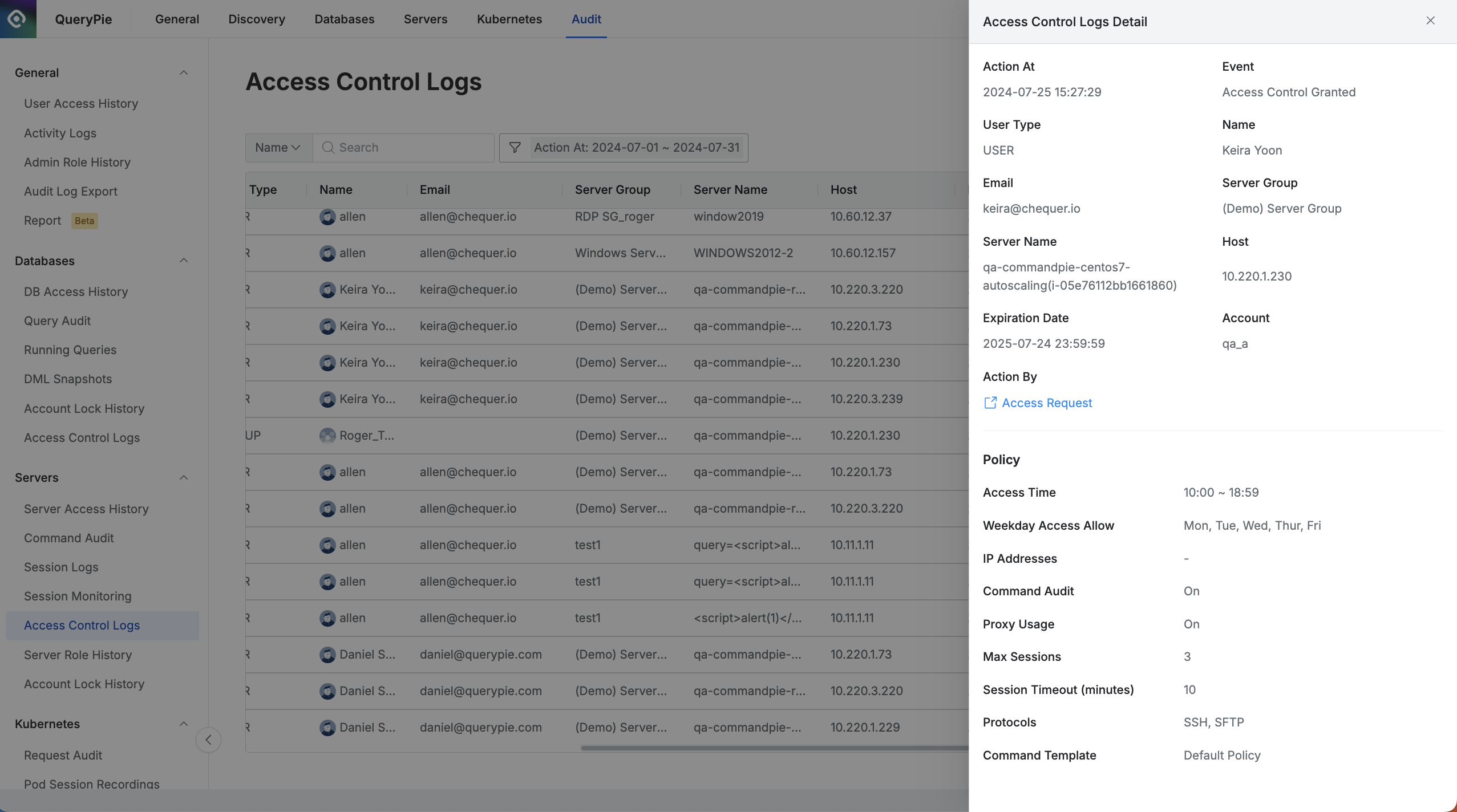 Administrator > Audit > Servers > Access Control Logs > Access Control Logs Detail
