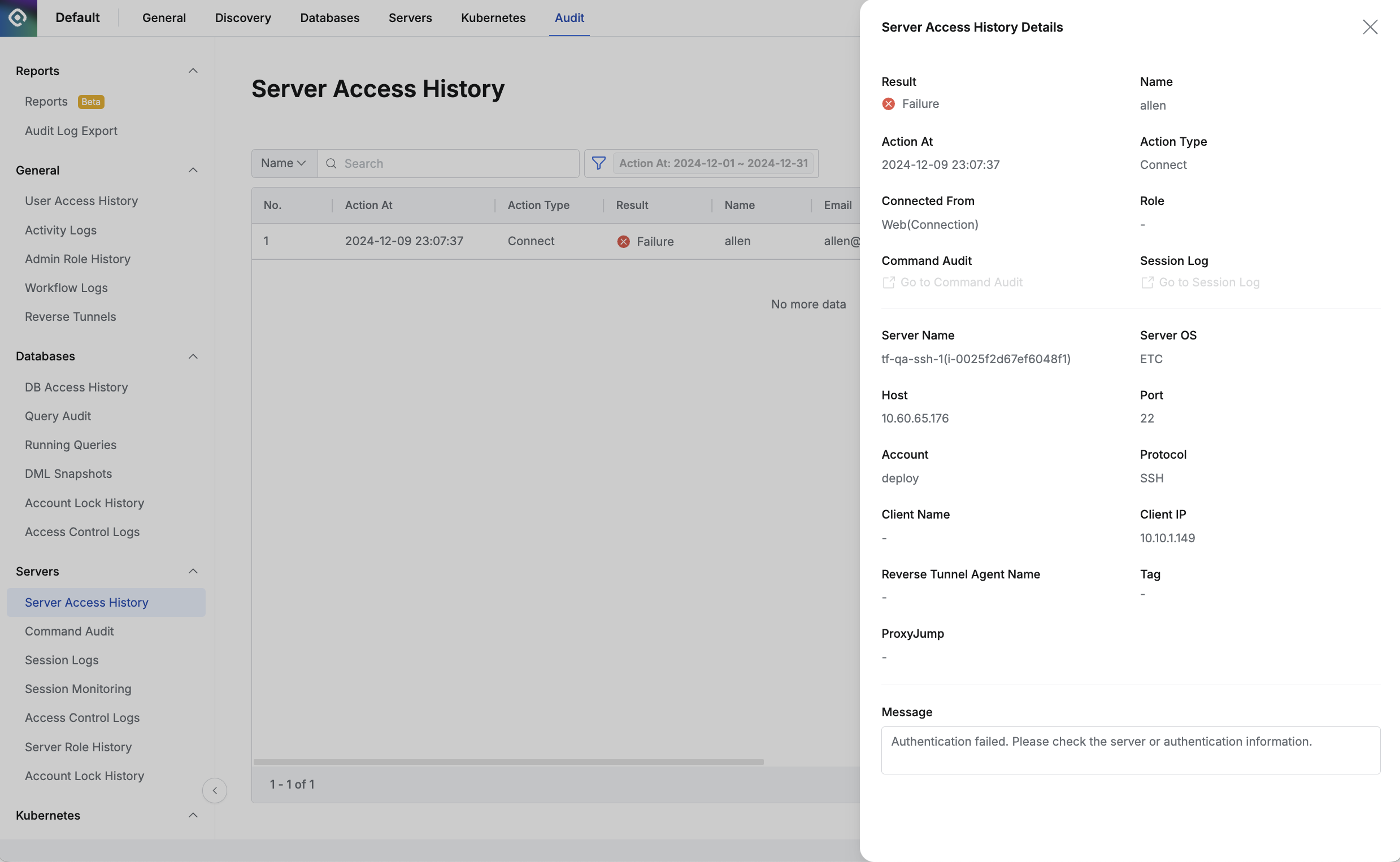 Administrator > Audit > Servers > Server Access History > Server Access History Details