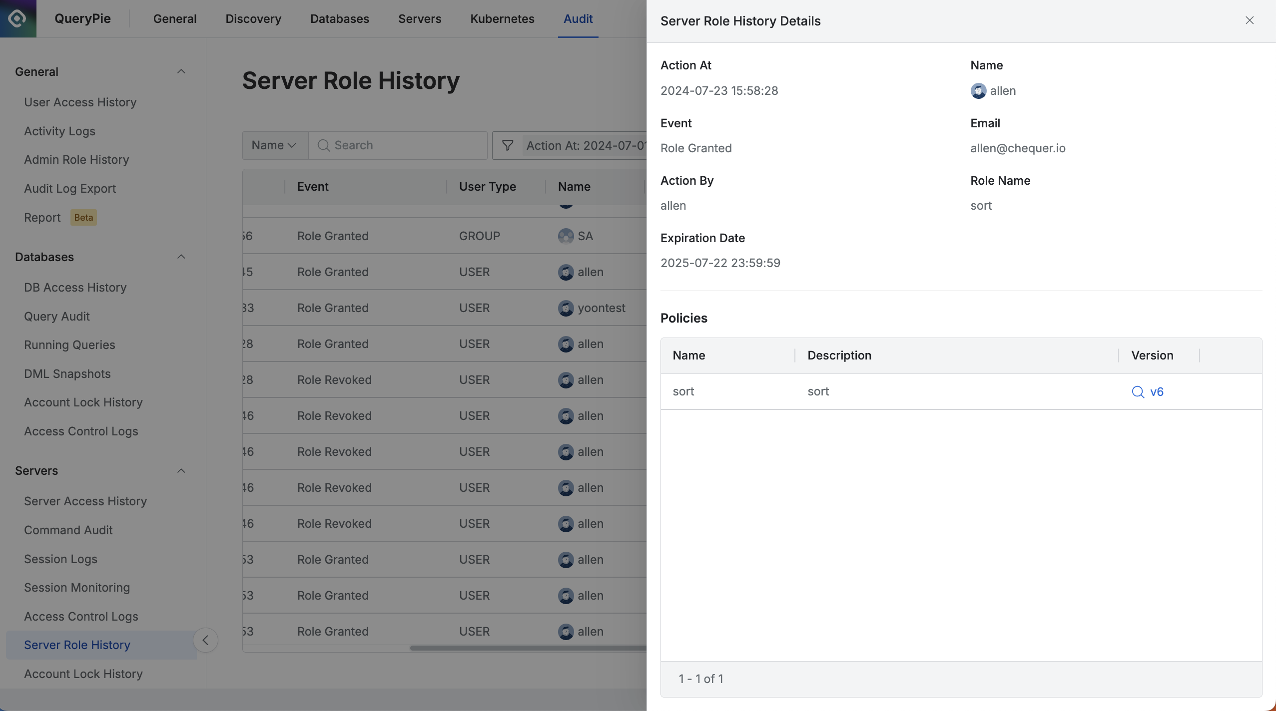 クエリパイユーザー/グループに付与されるサーバーアクセスRoleに対する付与および回収履歴を記録します。