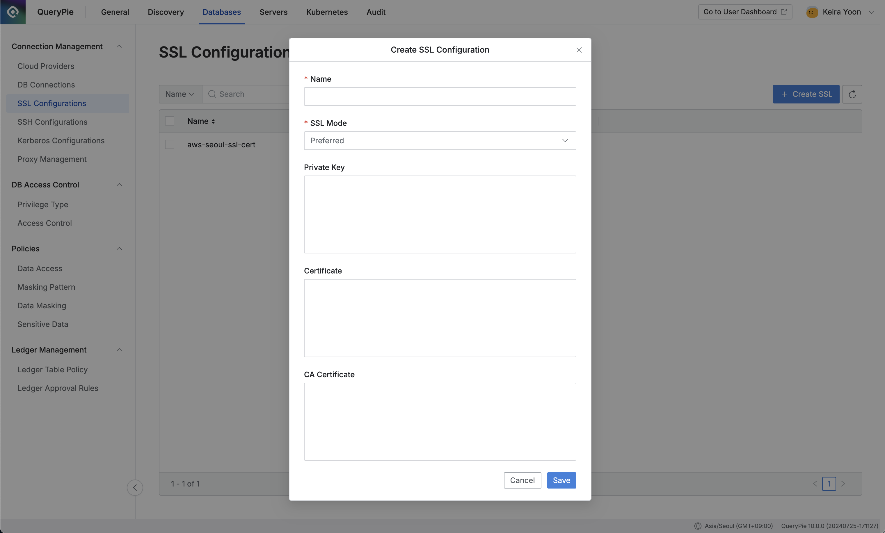 - Databases設定メニューからConnection Management > SSL Configurationメニューに移動します。
