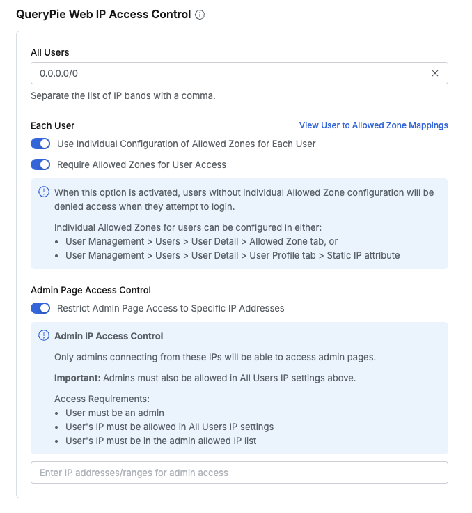 - このオプションを活性化すると、個別IP許可領域(Allowed Zone)が設定されていないユーザーはQueryPieにログインできません。ログインページアクセスは可能ですが、ログイン試行が遮断されます。