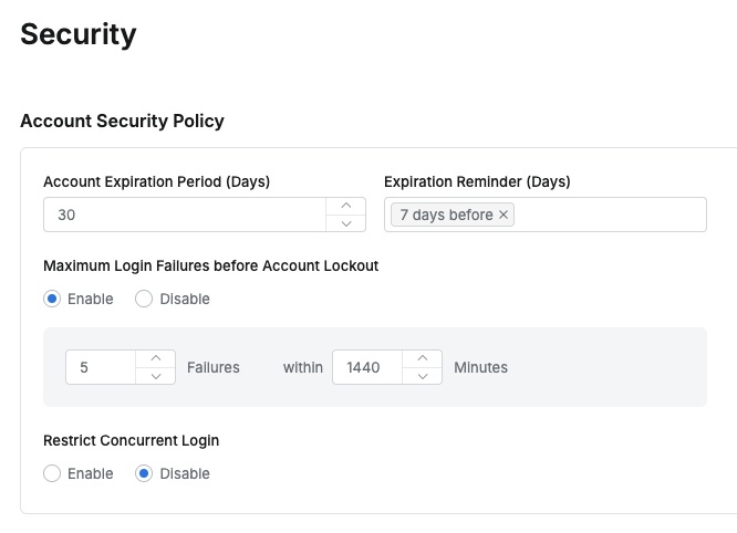 - Account Expiration Period (Days) : アカウント期限切れ処理のための長期未接続日数基準