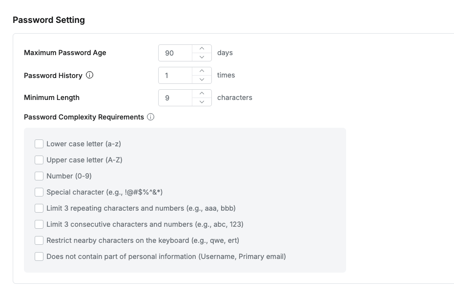 - Does not contain part of personal information (Username, Primary email) : パスワード内個人情報(Username, Primary email)使用制限