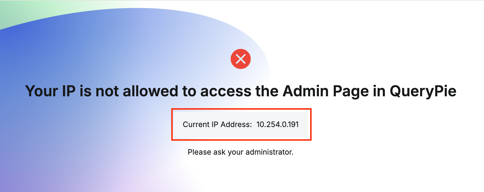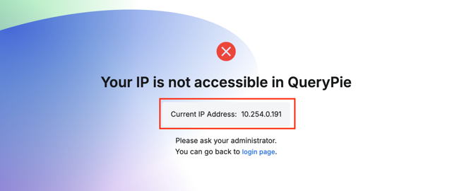 Q. もしユーザーが許可されていないIPからQueryPieウェブコンソール接続試行時どの画面を見ることになりますか? A. 許可されていないIPから接続試行時QueryPieウェブコンソール内どのページでもアクセス不可で下記のような案内画面を見ることになります。 もしAll Usersに基本値(0.0.0.0/0)が登録されており、個別ユーザーに特定Allowed Zoneが設定されているならログインページまでは接続可能ですがログインは不可になります。