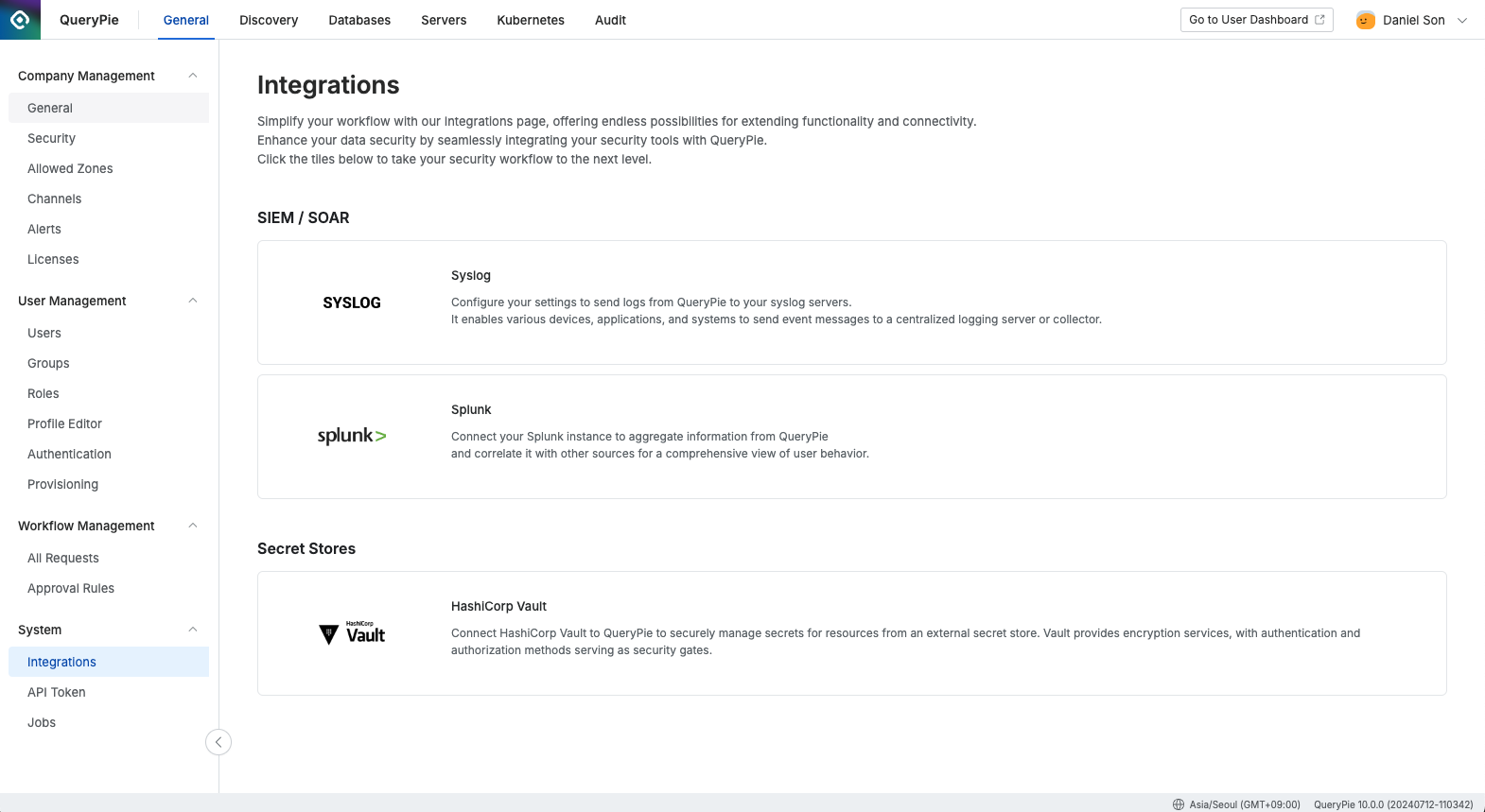 Integrationメニューでは外部セキュリティサービスとの連携を簡単にサポートします。 多様なセキュリティツールとの連携を通じてシステムセキュリティを強化し、システムの複雑性を減らし、管理およびメンテナンスを単純化できます。 10.0.0バージョン現在、SIEM/SOARおよびSecret Store連携をサポートしており、サポートしているSIEMサービスはSyslog、Splunkの2種です。