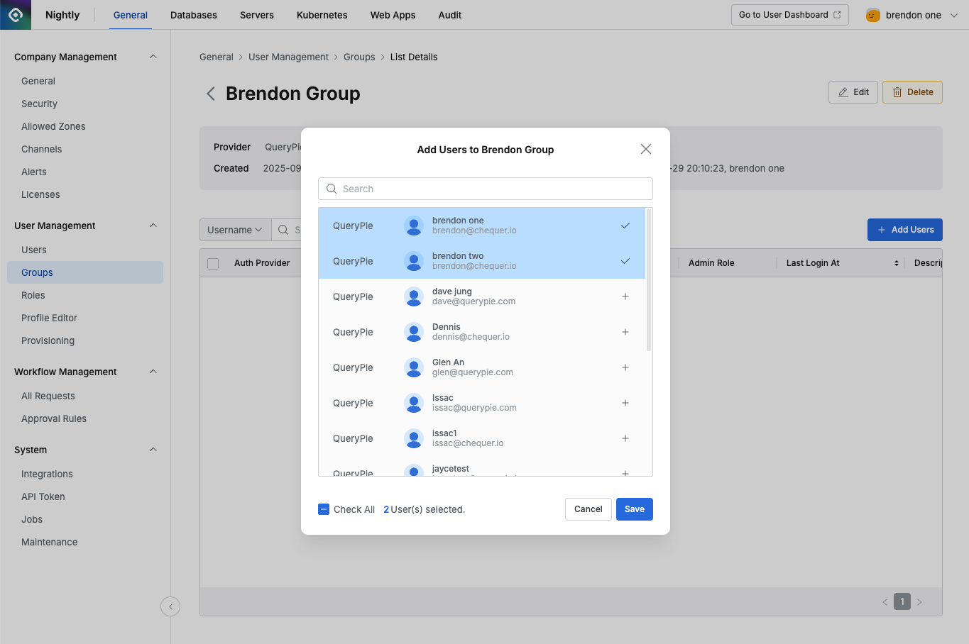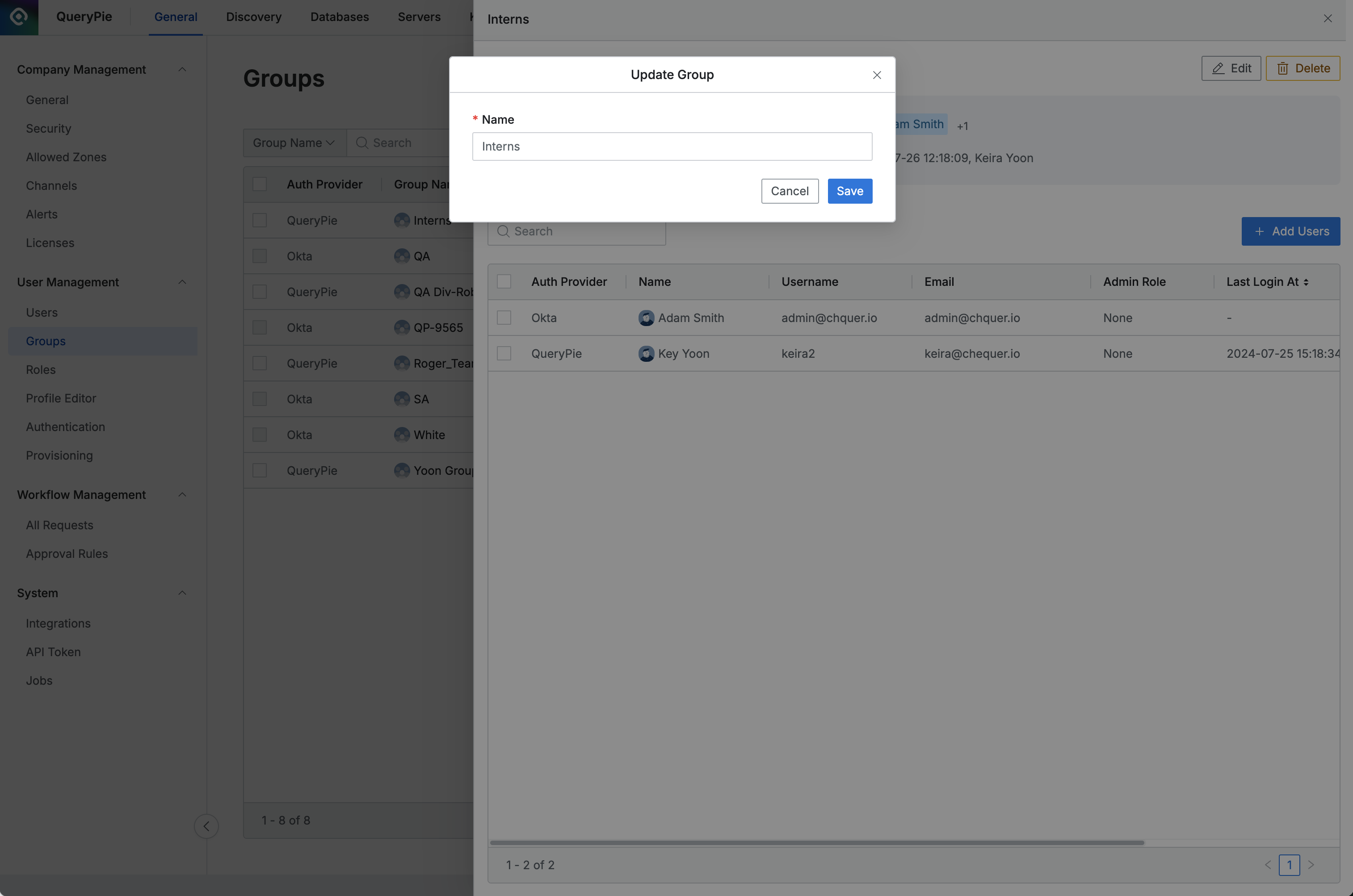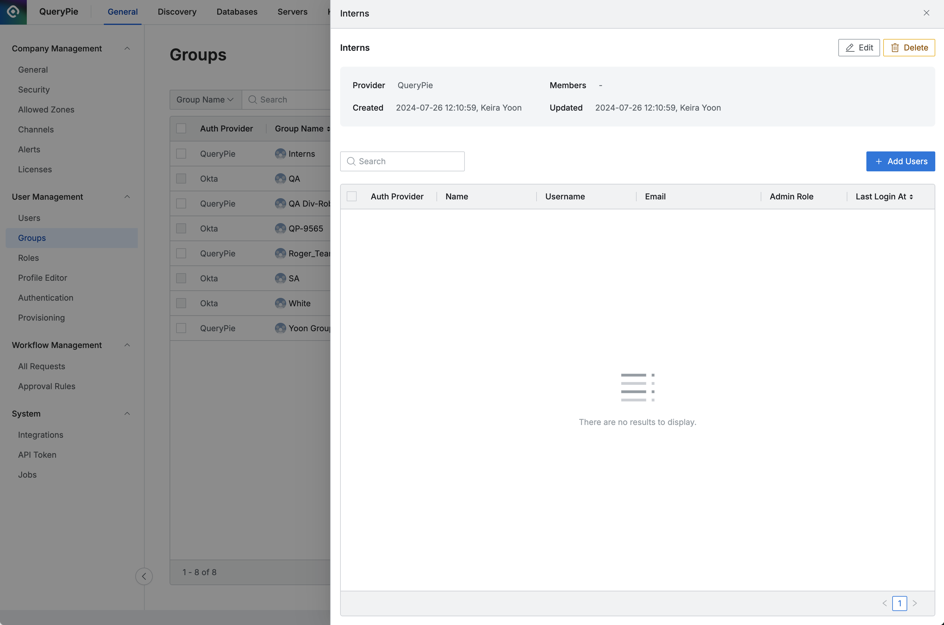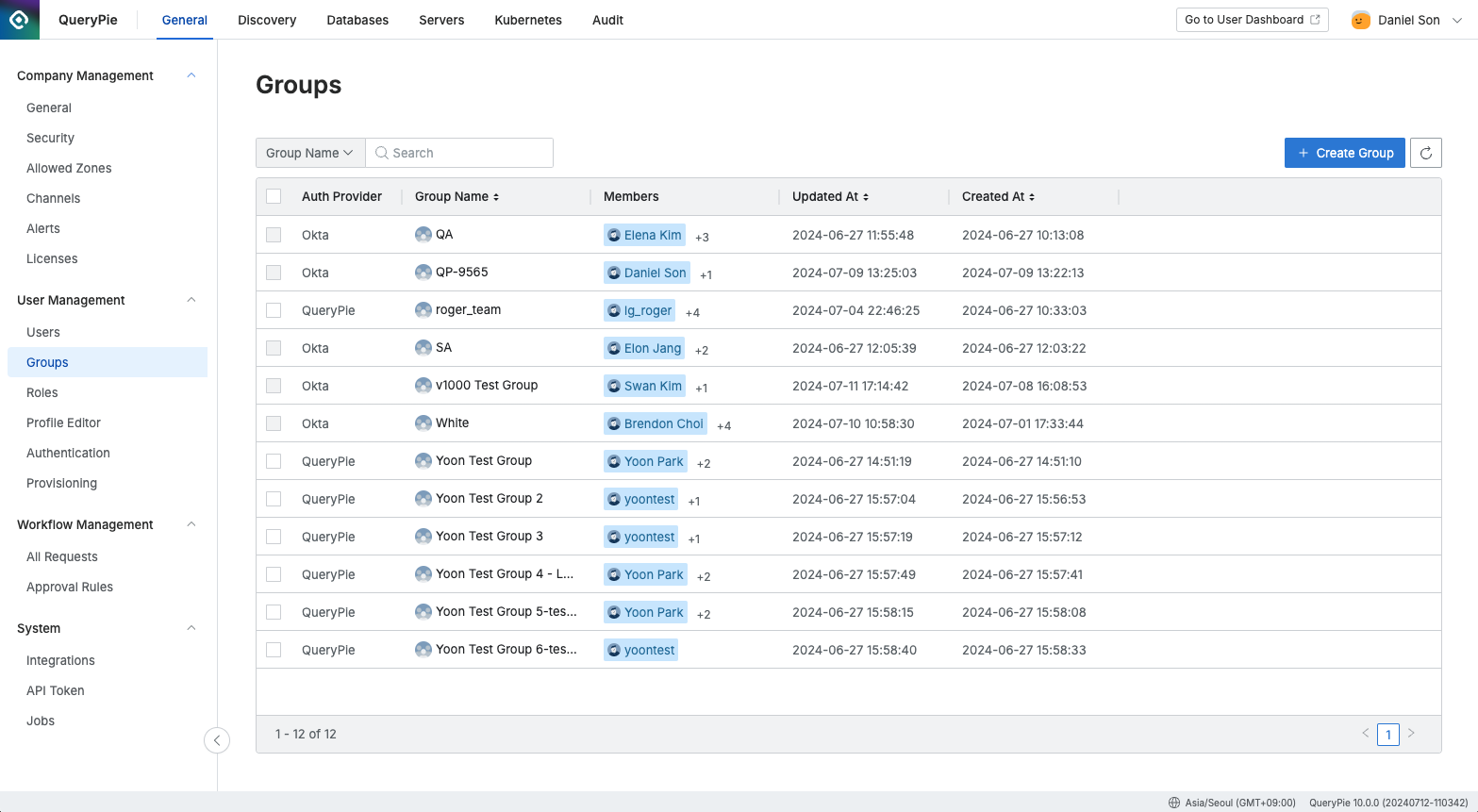 QueryPieでは、ユーザーをグループ単位でまとめて一括管理できるグループ機能を提供します。 グループはDBアクセス権限、Workflow承認/検討者役割、サーバーやKubernetes役割(Role)付与時の単位として使用できます。 Groupsページでは、QueryPieに登録されたユーザーグループリストを照会および管理します。
