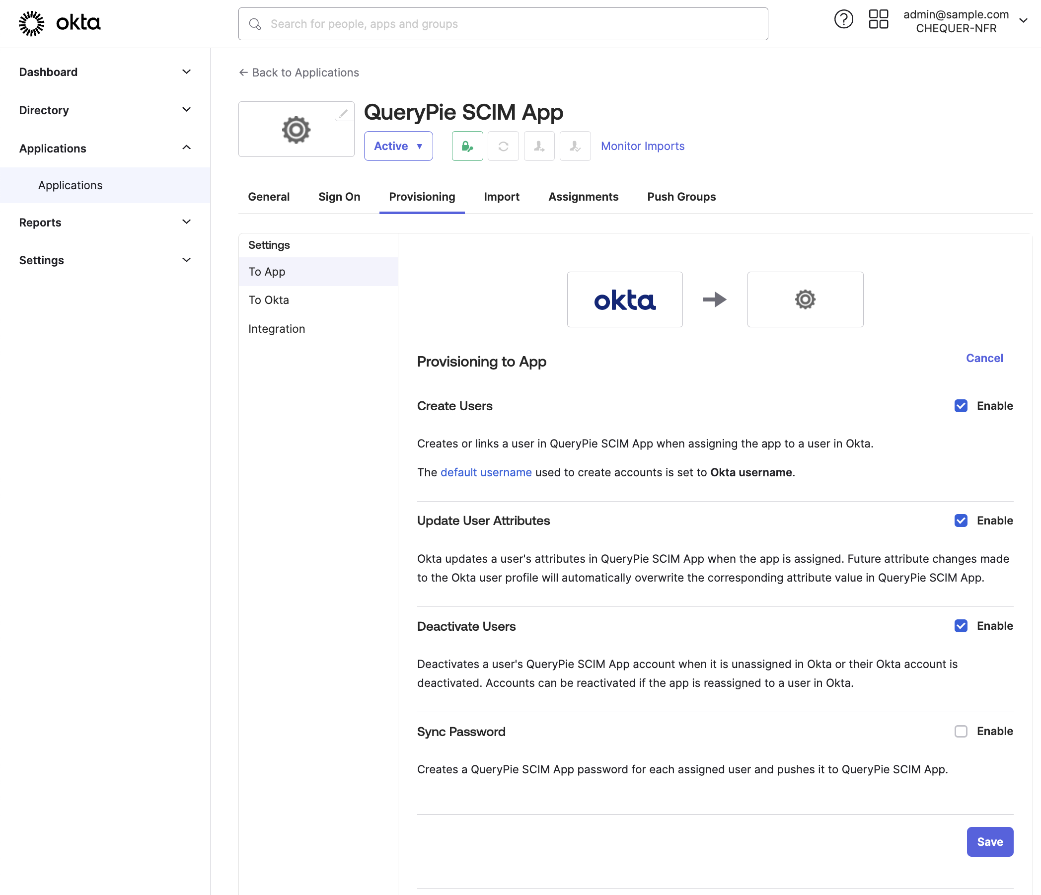 Saveボタンをクリックします。 - Okta連動 | OktaでQueryPieアプリケーション連動情報設定およびOkta連動 | QueryPieでOkta連動および同期設定に従ってSSO連動を完了した後、以降のステップを進行してください。