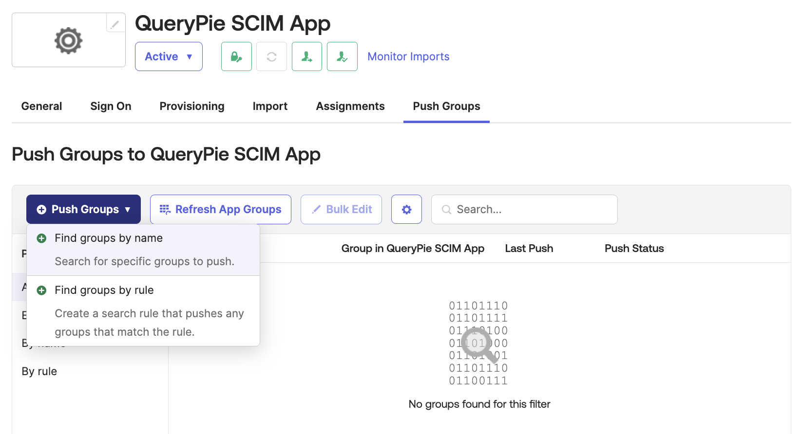 Okta Admin Console > Applications > Applications > Custom SCIM App > Push Groups