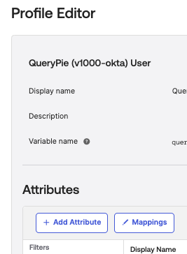 {{querypie.domain}}/saml/sp/metadata - Attribute Statements (optional):QueryPie url必須attributeを以下のように記入します。