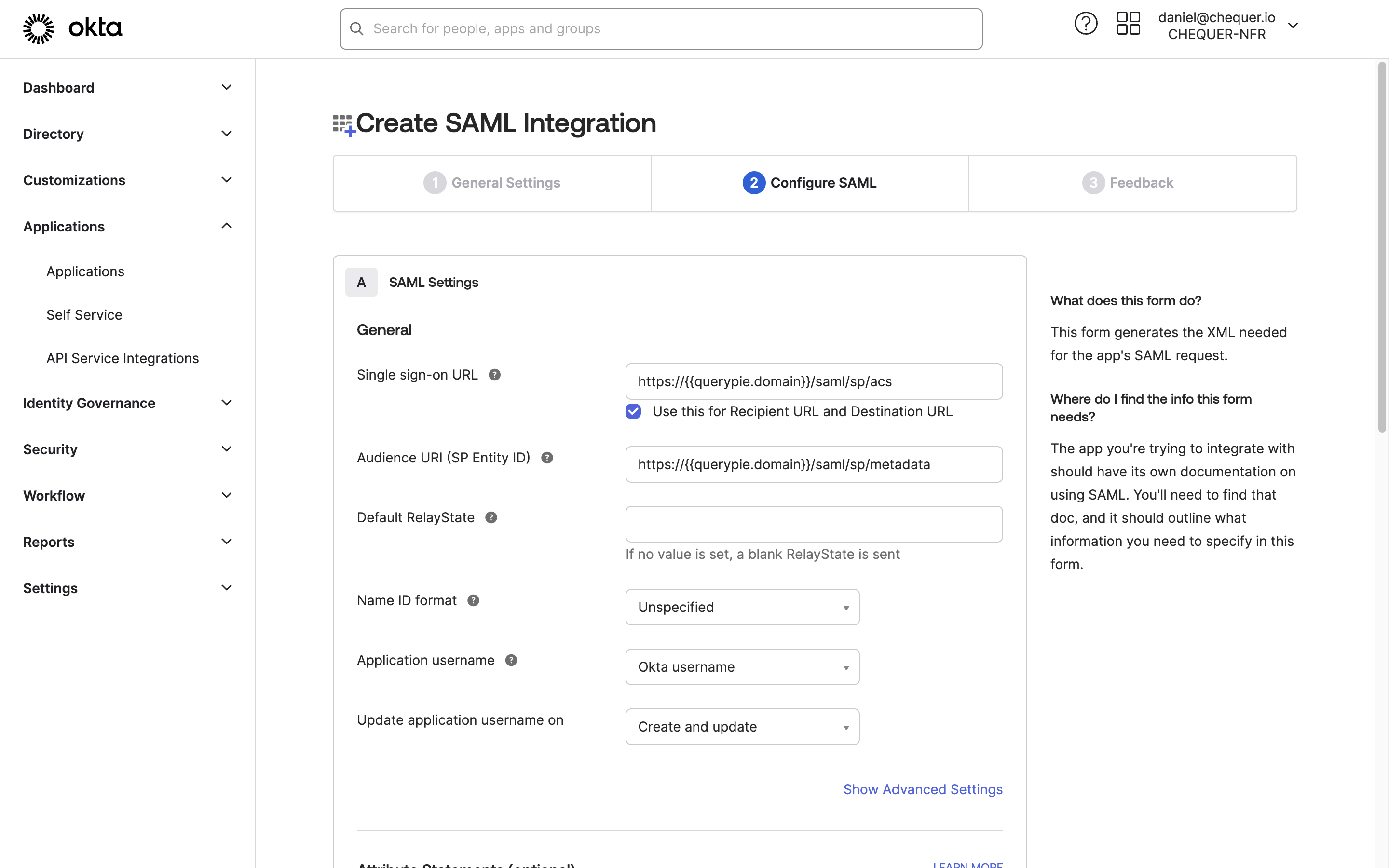 Okta Admin Console > Applications > Applications > Create App Integration > SAML 2.0 > Configure SAML