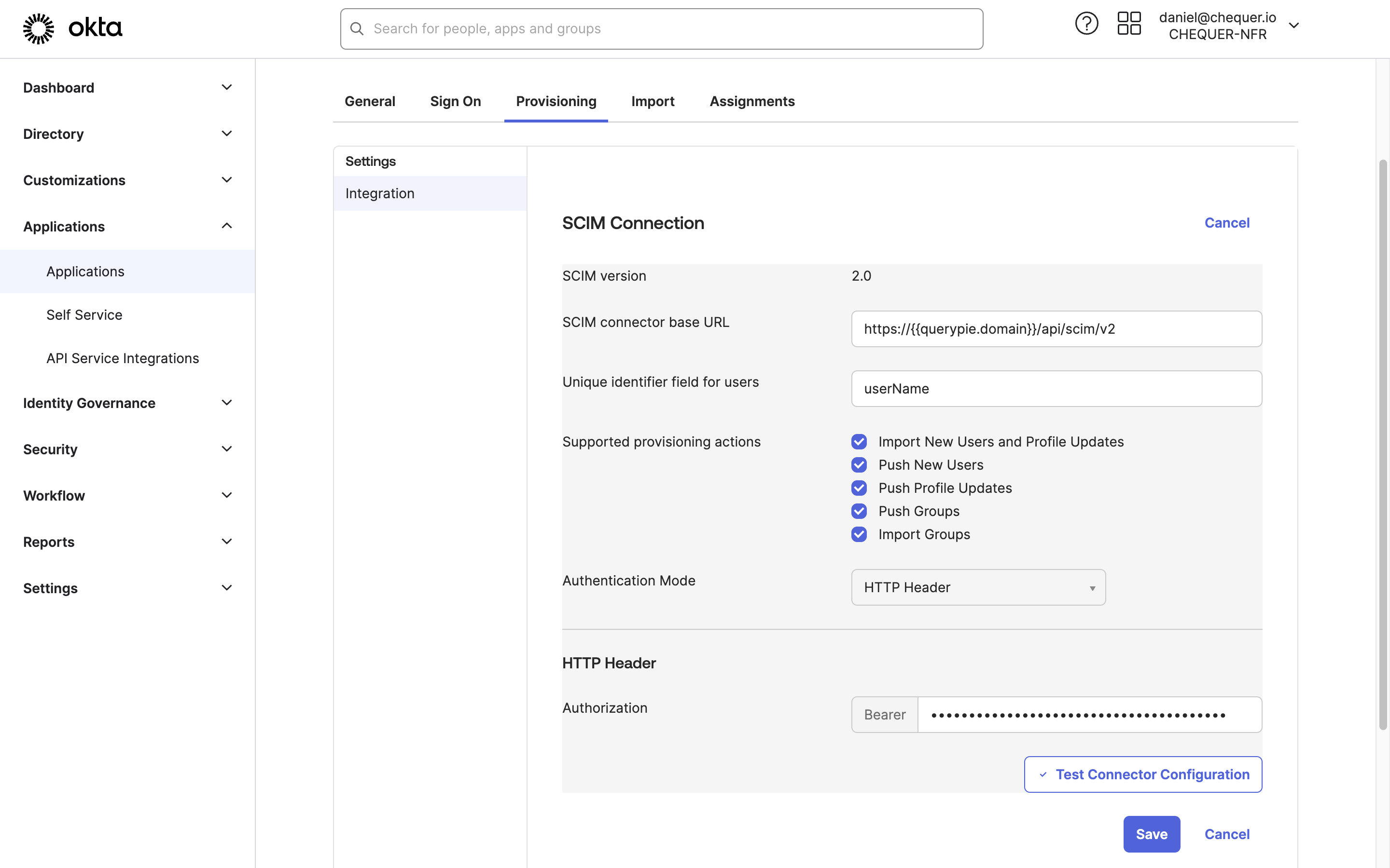 Okta Admin Console > Applications > Applications > Custom SCIM App > Provisioning > Integration