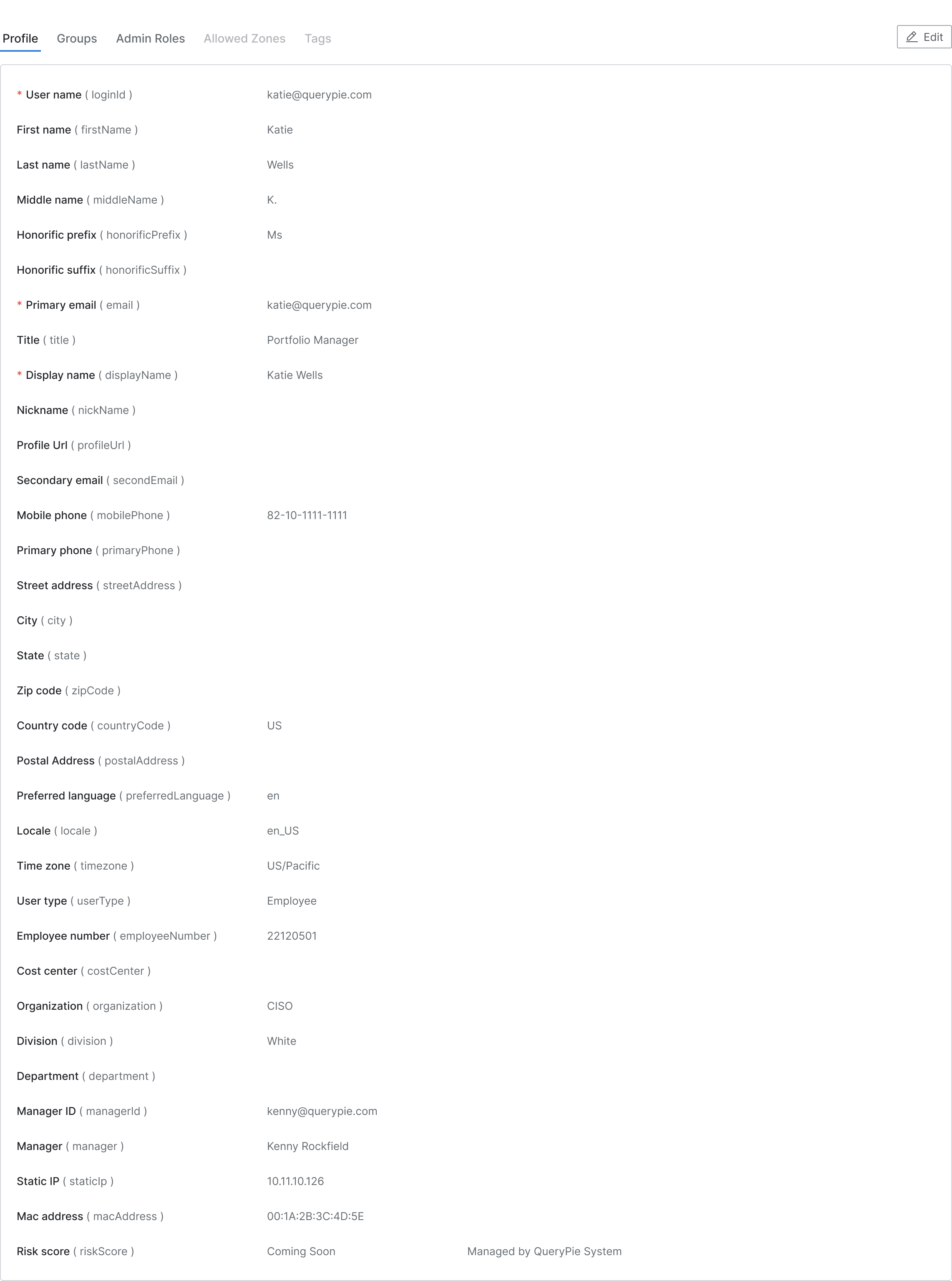 | Risk score | riskScore | ユーザー危険指数(QueryPie Systemで管理) | 今後提供予定 |