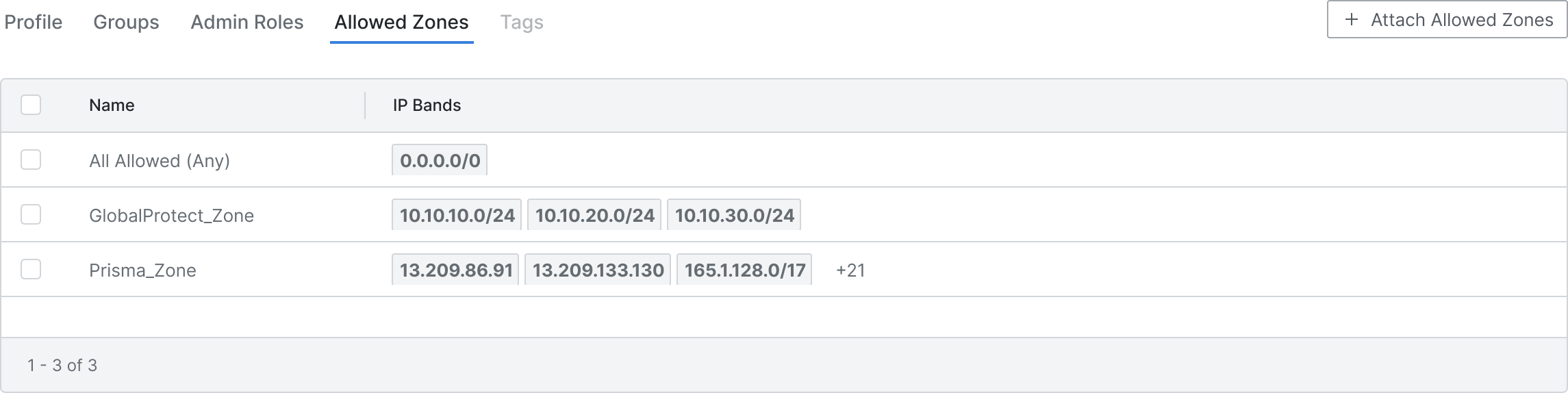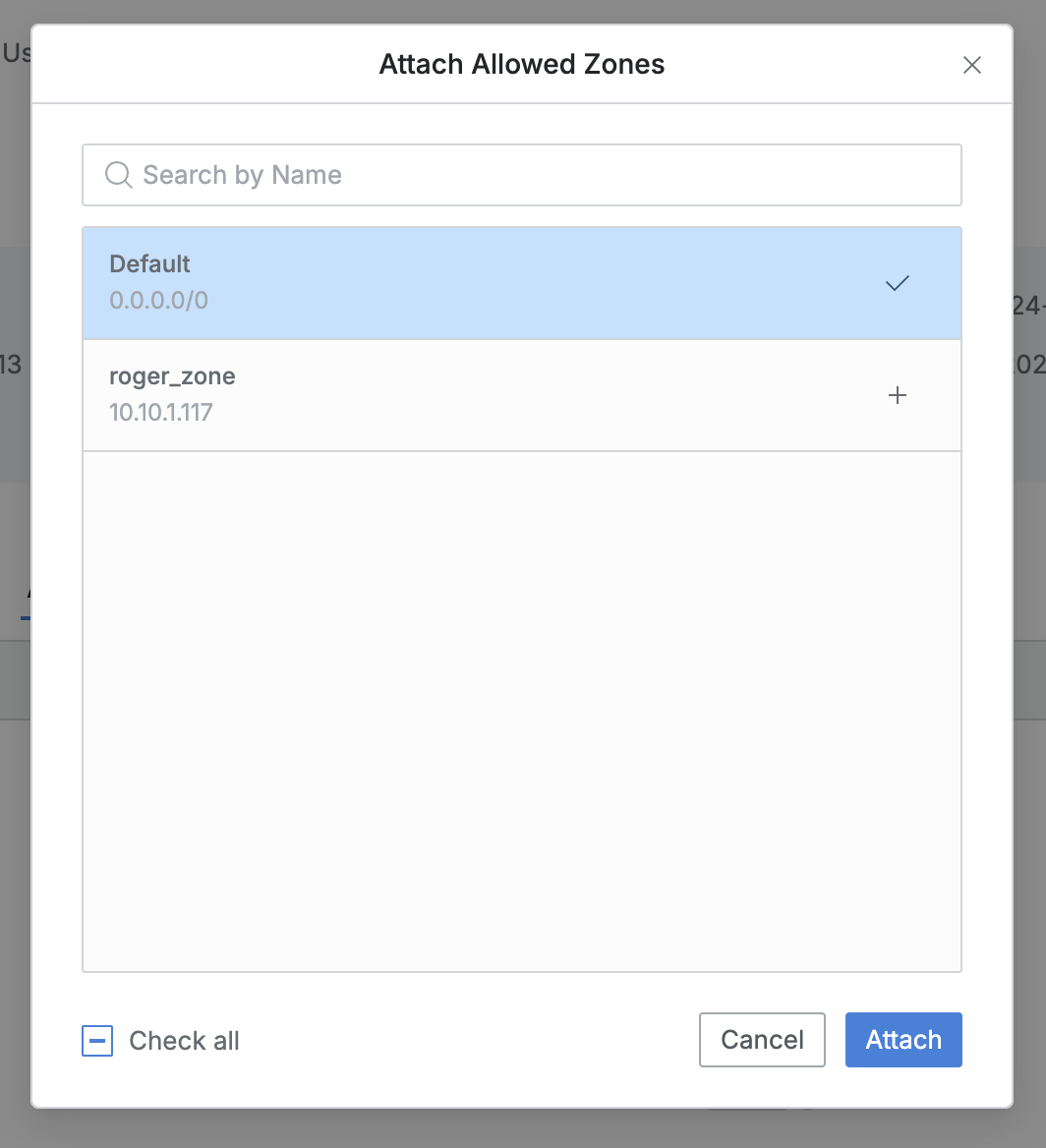 Allowed Zonesタブ右側Attach Allowed ZonesボタンをクリックするとAllowed Zone割り当てモーダルが出力されます。