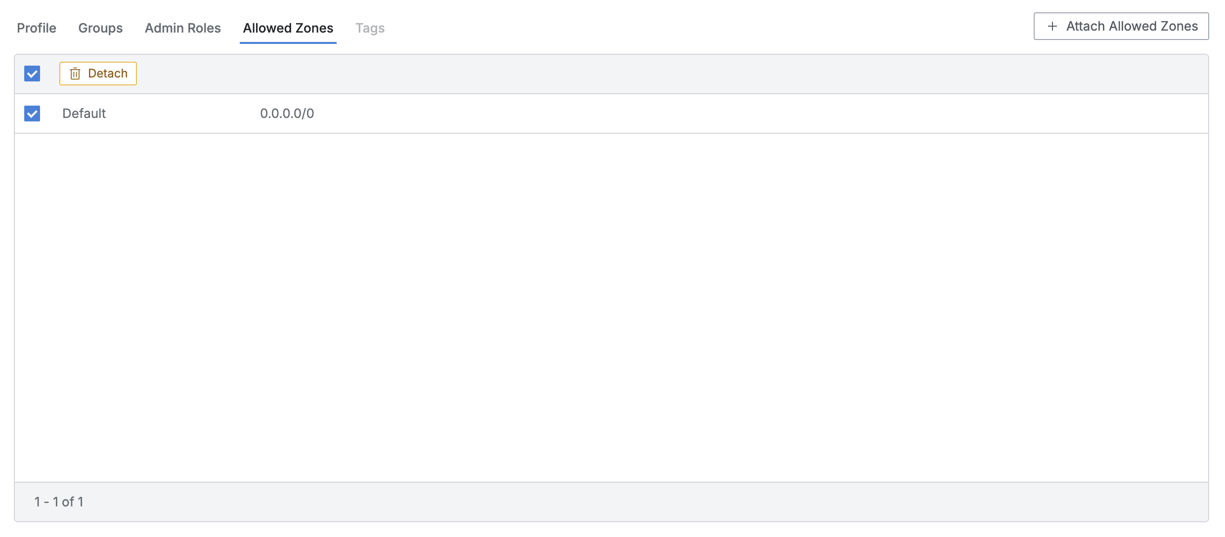 Allowed Zoneタブ下部リストで割り当てを解除しようとする項目をチェックボックスで選択するとDetachボタンが露出されます。