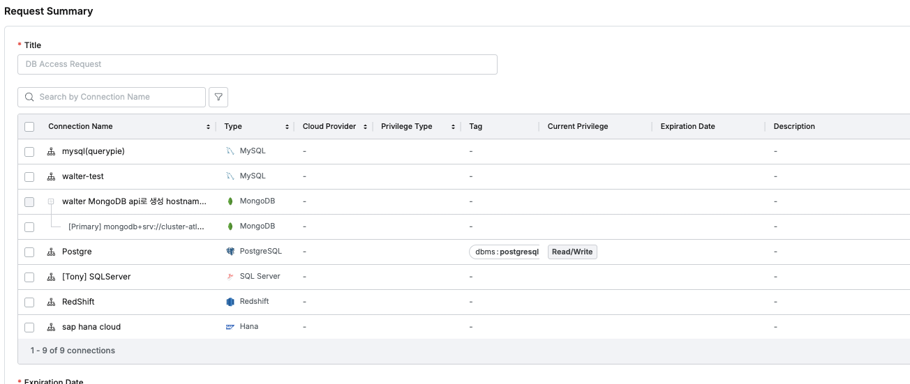 - DB Access Request:DB Connectionに付与されたタグを目録で見ることができ、フィルターを通じて特定タグがあるコネクションのみフィルタリングできます。