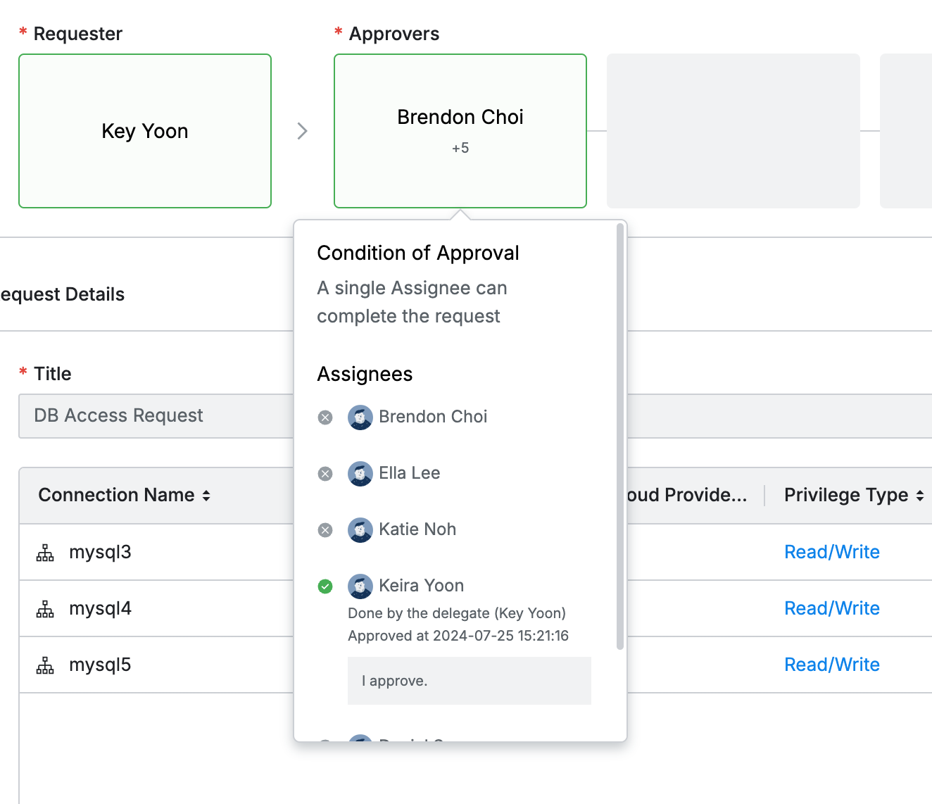 - Received Requests > Done : 代理決裁設定期間内に代理決裁者が処理したリクエストを見ることができます。