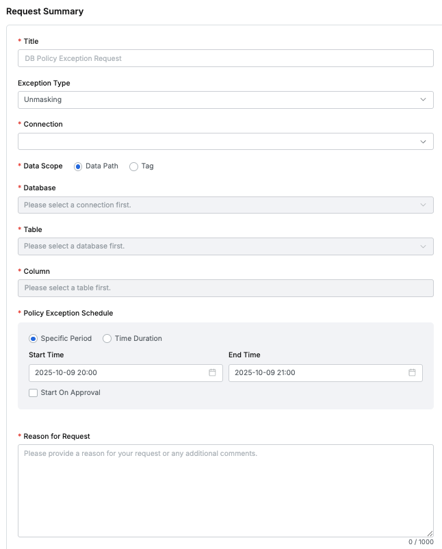 DB Policy Exception Requestは既存政策と異なり、UnmaskingとRestricted Data Accessが別々のフォームで分離されていない一つのフォームでException TypeをUnmasking、Restricted Data Accessのいずれかを選択する方式です。