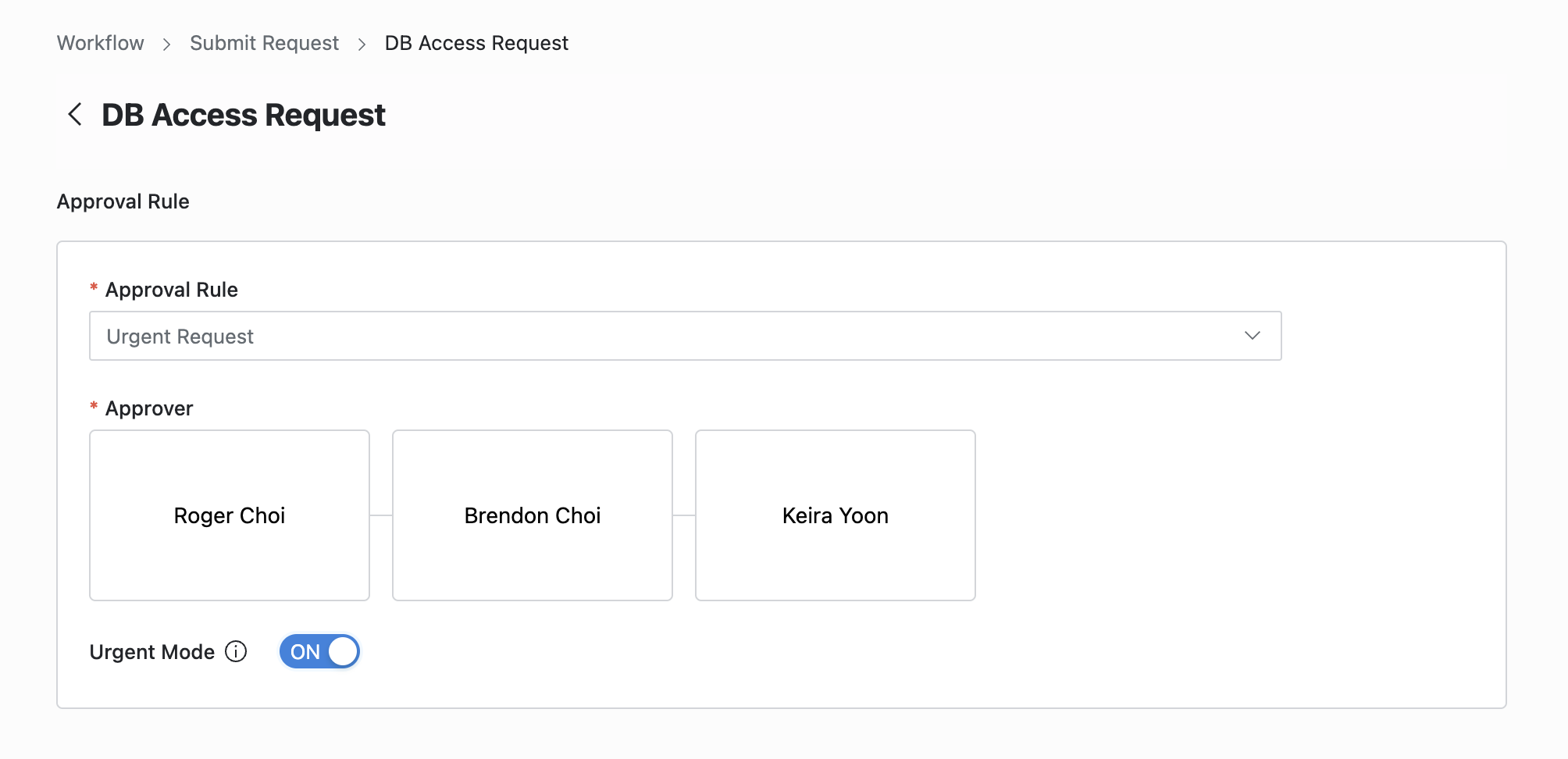 - 事後承認機能が許可された承認ルールを選択した場合、Urgent Modeスイッチが表示されます。